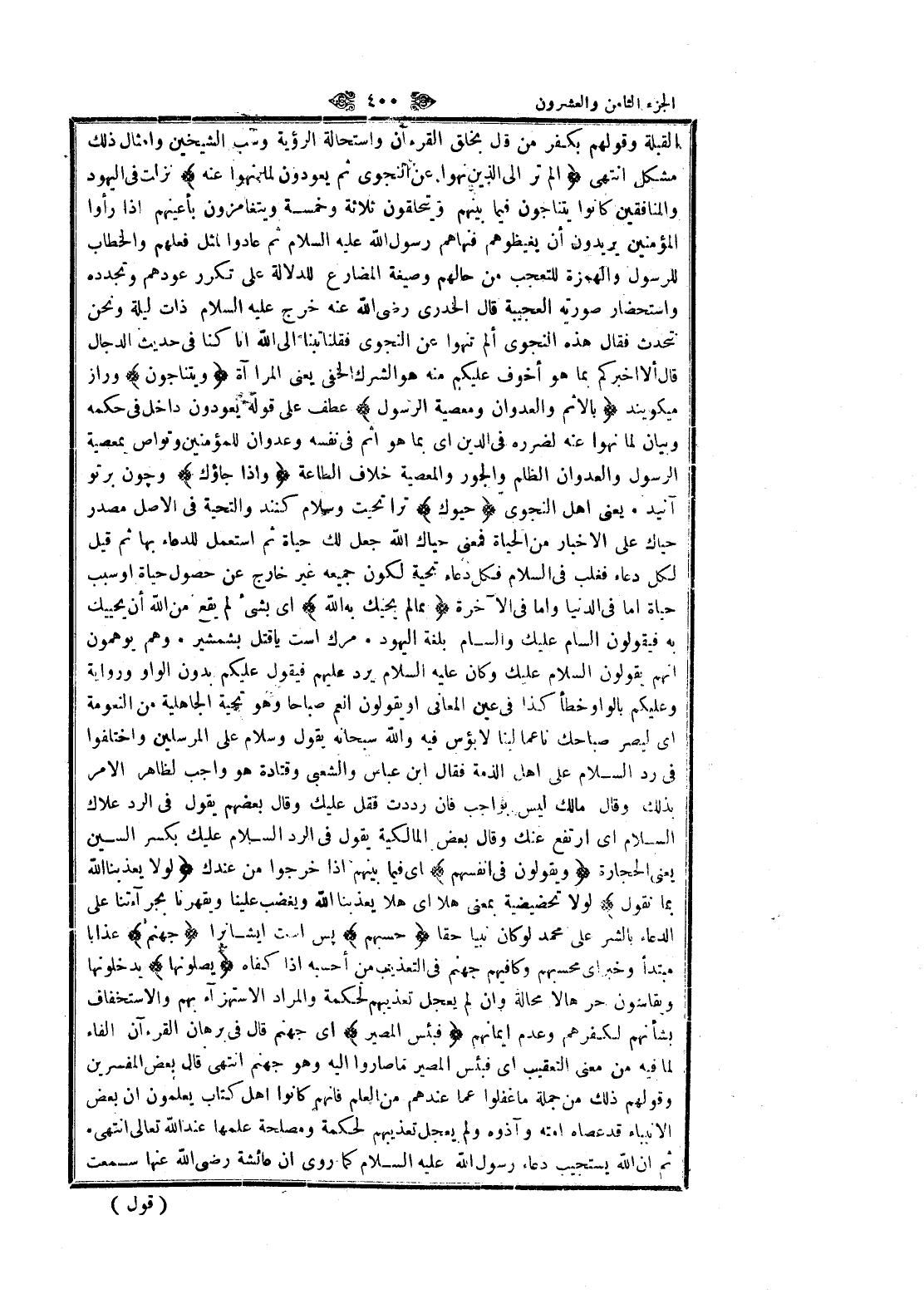 القبلة وقولهم بكفر من قال بخلق القرآن واستحالة الرؤية وسب الشيخين وأمثال ذلك مشكل انتهى أَلَمْ تَرَ إِلَى الَّذِينَ نُهُوا عَنِ النَّجْوى ثُمَّ يَعُودُونَ لِما نُهُوا عَنْهُ نزلت في اليهود والمنافقين كانوا يتناجون فيما بينهم ويتحلقون ثلاثة وخمسة ويتغامزون بأعينهم إذا رأوا المؤمنين يريدون أن يغيظوهم فنهاهم رسول الله عليه السلام ثم عادوا لمثل فعلهم والخطاب للرسول والهمزة للتعجب من حالهم وصيغة المضارع للدلالة على تكرر عودهم وتجدده واستحضار صورته العجيبة قال الخدري رضى الله عنه خرج عليه السلام ذات ليلة ونحن نتحدث فقال هذه النجوى ألم تنهوا عن النجوى فقلنا تبنا الى الله انا كنا في حديث الدجال قال ألا أخبركم بما هو أخوف عليكم منه هو الشرك الخفي يعنى المرآة وَيَتَناجَوْنَ وراز ميكويند بِالْإِثْمِ وَالْعُدْوانِ وَمَعْصِيَةِ الرَّسُولِ عطف على قوله يعودون داخل في حكمه وبيان لما نهوا عنه لضرره في الدين اى بما هو اثم في نفسه وعدوان للمؤمنين وتواص بمعصية الرسول والعدوان الظلم والجور والمعصية خلاف الطاعة وَإِذا جاؤُكَ و چون بر تو آنيد يعنى اهل النجوى حَيَّوْكَ ترا تحيت وسلام كنند والتحية في الأصل مصدر حياك على الاخبار من الحياة فمعنى حياك الله جعل لك حياة ثم استعمل للدعاء بها ثم قيل لكل دعاء فغلب في السلام فكل دعاء تحية لكون جميعه غير خارج عن حصول حياة او سبب حياة اما في الدنيا واما في الآخرة بِما لَمْ يُحَيِّكَ بِهِ اللَّهُ اى بشيء لم يقع من الله أن يحييك به فيقولون السام عليك والسام بلغة اليهود مرك است يا قتل بشمشير وهم يوهمون انهم يقولون السلام عليك وكان عليه السلام يرد عليهم فيقول عليكم بدون الواو ورواية وعليكم بالواو خطأ كذا في عين المعاني او يقولون أنعم صباحا وهو تحية الجاهلية من النعومة اى ليصر صباحك ناعما لينا لا بؤس فيه والله سبحانه يقول وسلام على المرسلين واختلفوا فى رد السلام على اهل الذمة فقال ابن عباس والشعبي وقتادة هو واجب لظاهر الأمر بذلك وقال مالك ليس بواجب فان رددت فقل عليك وقال بعضهم يقول في الرد علاك السلام اى ارتفع عنك وقال بعض المالكية يقول في الرد السلام عليك بكسر السين يعنى الحجارة وَيَقُولُونَ فِي أَنْفُسِهِمْ اى فيما بينهم إذا خرجوا من عندك لَوْلا يُعَذِّبُنَا اللَّهُ بِما نَقُولُ لولا تحضيضية بمعنى هلا اى هلا يعذبنا الله ويغضب علينا ويقهرنا بجراءتنا على الدعاء بالشر على محمد لو كان نبيا حقا حَسْبُهُمْ پس است ايشانرا جَهَنَّمُ عذابا مبتدأ وخبر اى محسبهم وكافيهم جهنم في التعذيب من أحسبه إذا كفاه يَصْلَوْنَها يدخلونها ويقاسون حرها لا محالة وان لم يعجل تعذيبهم لحكمة والمراد الاستهزاء بهم والاستخفاف بشأنهم لكفرهم وعدم ايمانهم فَبِئْسَ الْمَصِيرُ اى جهنم قال في برهان القرآن الفاء لما فيه من معنى التعقيب اى فبئس المصير ما صاروا اليه وهو جهنم انتهى قال بعض المفسرين وقولهم ذلك من جملة ما غفلوا عما عندهم من العلم فانهم كانوا اهل كتاب يعلمون ان بعض الأنبياء قد عصاه أمته وآذوه ولم يعجل تعذيبهم لحكمة ومصلحة علمها عند الله تعالى انتهى ثم ان الله يستجيب دعاء رسول الله عليه السلام كما روى ان عائشة رضى الله عنها سمعت