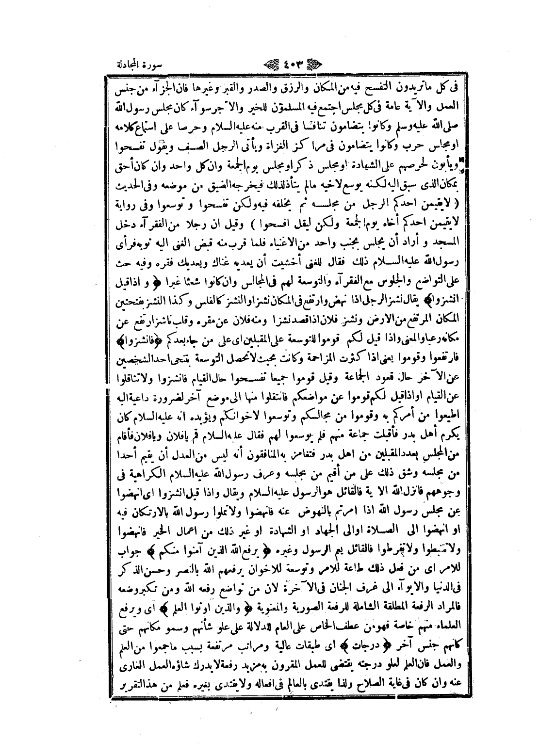 للغنى أخشيت أن يعديه غناك ويعديك فقره وفيه حث على التواضع والجلوس مع الفقراء والتوسعة لهم في المجالس وان كانوا شعثا غبرا وَإِذا قِيلَ انْشُزُوا يقال نشز الرجل إذا نهض وارتفع في المكان نشزا والنشز كالفلس وكذا النشز بفتحتين المكان المرتفع من الأرض ونشز فلان إذا قصد نشزا ومنه فلان عن مقره وقلب ناشز ارتفع عن مكانه رعبا والمعنى وإذا قيل لكم قوموا للتوسعة على المقبلين اى على من جاء بعدكم فَانْشُزُوا فارتفعوا وقوموا يعنى إذا كثرت المزاحمة وكانت بحيث لا تحصل التوسعة بتنحى أحد الشخصين عن الآخر حال قعود الجماعة وقيل قوموا جميعا تفسحوا حال القيام فانشزوا ولا تثاقلوا عن القيام او إذا قيل لكم قوموا عن مواضعكم فانتقلوا منها الى موضع آخر لضرورة داعية اليه أطيعوا من أمركم به وقوموا من مجالسكم وتوسعوا لاخوانكم ويؤيده انه عليه السلام كان يكرم أهل بدر فأقبلت جماعة منهم فلم يوسعوا لهم فقال عليه السلام قم يا فلان ويا فلان فأقام من المجلس بعدد المقبلين من اهل بدر فتغامز به المنافقون أنه ليس من العدل أن يقيم أحدا من مجلسه وشق ذلك على من أقيم من مجلسه وعرف رسول الله عليه السلام الكراهية في وجوههم فانزل الله الاية فالقائل هو الرسول عليه السلام ويقال وإذا قيل انشزوا اى انهضوا عن مجلس رسول الله إذا أمرتم بالنهوض عنه فانهضوا ولا تملوا رسول الله بالارتكان فيه او انهضوا الى الصلاة او الى الجهاد او الشهادة او غير ذلك من اعمال الخير فانهضوا ولا تتنبطوا ولا تفرطوا فالقائل يعم الرسول وغيره يَرْفَعِ اللَّهُ الَّذِينَ آمَنُوا مِنْكُمْ جواب للامر اى من فعل ذلك طاعة للامر وتوسعة للاخوان يرفعهم الله بالنصر وحسن الذكر فى الدنيا والإيواء الى غرف الجنان في الآخرة لان من تواضع رفعه الله ومن تكبر وضعه فالمراد الرفعة المطلقة الشاملة للرفعة الصورية والمعنوية وَالَّذِينَ أُوتُوا الْعِلْمَ اى ويرفع العلماء منهم خاصة فهو من عطف الخاص على العام للدلالة على علو شأنهم وسمو مكانهم حتى كانهم جنس آخر دَرَجاتٍ اى طبقات عالية ومراتب مرتفعة بسبب ما جمعوا من العلم والعمل فان العلم لعلو درجته يقتضى للعمل المقرون به مزيد رفعة لا يدرك شاؤه العمل الغارى عنه وان كان في غاية الصلاح ولذا يقتدى بالعالم في أفعاله ولا يقتدى بغيره فعلم من هذا التقرير