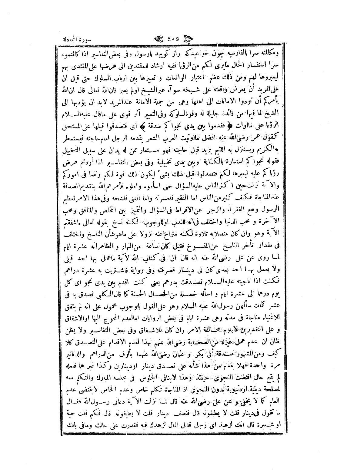 ومكالمته سرا بالفارسية چون خواهيد كه راز كوييد با رسول وفي بعض التفاسير إذا كالمتموه سرا استفسار الحال ما يرى لكم من الرؤيا ففيه ارشاد للمتقدين الى عرضها على المقتدى بهم ليعبروها لهم ومن ذلك عظم اعتبار الواقعات وتعبيرها بين ارباب السلوك حتى قيل ان على المريد أن يعرض واقعته على شيخه سوآء عبر الشيخ او لم يعبر فان الله تعالى قال ان الله يأمركم أن تودوا الأمانات الى أهلها وهى من جملة الامانة عند المريد لا بد ان يؤديها الى الشيخ لما فيها من فائدة جليلة له وقوة لسلوكه وفي التعبير أثر قوى على ما قال عليه السلام الرؤيا على ما اولت فَقَدِّمُوا بَيْنَ يَدَيْ نَجْواكُمْ صَدَقَةً اى فتصدقوا قبلها على المستحق كقول عمر رضى الله عنه أفضل ما أوتيت العرب الشعر يقدمه الرجل امام حاجته فيستمطر به الكريم ويستنزل به اللئيم يريد قبل حاجته فهو مستعار ممن له يدان على سبيل التخييل فقوله نجواكم استعارة بالكناية وبين يدى تخييلية وفي بعض التفاسير إذا أردتم عرض رؤياكم عليه ليعبرها لكم فتصدقوا قبل ذلك بشيء ليكون ذلك قوة لكم ونفعا في أموركم والآية نزلت حين اكثر الناس عليه السؤال حتى اسأموه واملوه فأمرهم الله بتقديم الصدقة عند المناجاة فكف كثير من الناس اما الفقير فلعسرته واما الغنى فلشحه وفي هذا الأمر تعظيم الرسول ونفع الفقراء والزجر عن الافراط في السؤال والتمييز بين المخلص والمنافق ومحب الآخرة ومحب الدنيا واختلف في انه للندب او للوجوب لكنه نسخ بقوله تعالىء أشفقتم الآية وهو وان كان متصلا به تلاوة لكنه متراخ عنه نزولا على ما هو شأن الناسخ واختلف فى مقدار تأخر الناسخ عن المنسوخ فقيل كان ساعة من النهار والظاهر انه عشرة ايام لما روى عن على رضى الله عنه انه قال ان في كتاب الله لآية ما عمل بها أحد قبلى ولا يعمل بها أحد بعدي كان لى دينار فصرفته وفي رواية فاشتريت به عشرة دراهم فكنت إذا ناجيته عليه السلام تصدقت بدرهم يعنى كنت اقدم بين يدى نجو اى كل يوم درهما الى عشرة ايام واسأله خصلة من الخصال الحسنة كما قال الكلبي تصدق به في عشر كلمات سألهن رسول الله عليه السلام وهو على القول بالوجوب محمول على انه لم يتفق للاغنياء مناجاة في مدته وهى عشرة ايام في بعض الروايات اما لعدم المحوج إليها او الإشفاق وعلى التقديرين لا يلزم مخالفة الأمر وان كان للاشفاق وفي بعض التفاسير ولا يظن ظان ان عدم عمل غيره من الصحابة رضى الله عنهم بهذا لعدم الاقدام على التصدق كلا كيف ومن المشهور صدقة أبى بكر وعثمان رضى الله عنهما بألوف من الدراهم والدنانير مرة واحدة فهلا يقدم