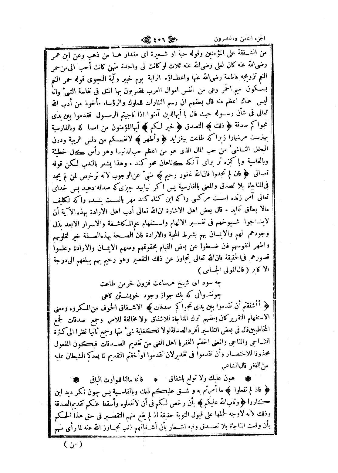 من الشفقة على المؤمنين وقوله حبة او شعيرة اى مقدارها من ذهب وعن ابن عمر رضى الله عنه كان لعلى رضى الله عنه ثلاث لو كانت لى واحدة منهن كانت أحب الى من حمر النعم تزويجه فاطمة رضى الله عنها وإعطاؤه الراية يوم خيبر وآية النجوى قوله حمر النعم بسكون ميم الحمر وهى من انفس اموال العرب يضربون بها المثل في نفاسة الشيء وانه ليس هناك أعظم منه قال بعضهم ان رسم النثارات للملوك والرؤساء مأخوذ من أدب الله تعالى في شأن رسوله حيث قال يا أيها الذين آمنوا إذا ناجيتم الرسول فقدموا بين يدى نجواكم صدقة ذلِكَ التصدق خَيْرٌ لَكُمْ أيها المؤمنون من إمساكه وبالفارسية بهترست مر شما را زيرا كه طاعت بيفزايد وَأَطْهَرُ لانفسكم من دنس الريبة ودرن البخل الناشئ من حب المال الذي هو من أعظم حب الدنيا وهو رأس كل خطيئة وبالفارسية و پاكيزه تر براى آنكه كناهان محو كند وهذا يشعر بالندب لكن قوله تعالى فَإِنْ لَمْ تَجِدُوا فَإِنَّ اللَّهَ غَفُورٌ رَحِيمٌ منبئ عن الوجوب لانه ترخيص لمن لم يجد فى المناجاة بلا تصدق والمعنى بالفارسية پس اگر نيابيد چيزى كه صدقه دهيد پس خداى تعالى آمرزنده است مر كسى را كه اين كناه كند مهربانست بنده را كه تكليف مالا يطاق ننمايد قال بعض اهل الاشارة ان الله تعالى أدب اهل الارادة بهذه الآية أن لا يناجوا شيوخهم في تفسير الإلهام واستفهام علم المكاشفة والاسرار إلا بعد بذل وجودهم لهم والايمان بهم بشرط المحبة والارادة فان الصحة بهذه الصفة خير لقلوبهم واطهر لنفوسهم فان ضعفوا عن بعض القيام بحقوقهم ومعهم الايمان والارادة وعلموا قصورهم في الحقيقة فان الله تعالى يتجاوز عن ذلك التقصير وهو رحيم بهم يبلغهم الى درجة الأكابر (قال المولى الجامى) چهـ سود اى شيخ هر ساعت فزون خرمن طاعت چونتوانى كه يك جواز وجود خويشتن كاهى أَأَشْفَقْتُمْ أَنْ تُقَدِّمُوا بَيْنَ يَدَيْ نَجْواكُمْ صَدَقاتٍ الإشفاق الخوف من المكروه ومعنى الاستفهام التقرير كان بعضهم ترك المناجاة للاشفاق ولا مخالفة للامر وجمع صدقات لجمع المخاطبين قال في بعض التفاسير أفرد الصدقة اولا لكفاية شيء منها وجمع ثانيا نظرا الى كثرة التناجي والمناجى والمعنى أخفتم الفقر يا اهل الغنى من تقديم الصدقات فيكون المفعول محذوفا للاختصار وأن تقدموا في تقدير لان تقدموا او أخفتم التقديم لما يعدكم الشيطان عليه من الفقر قال الشاعر