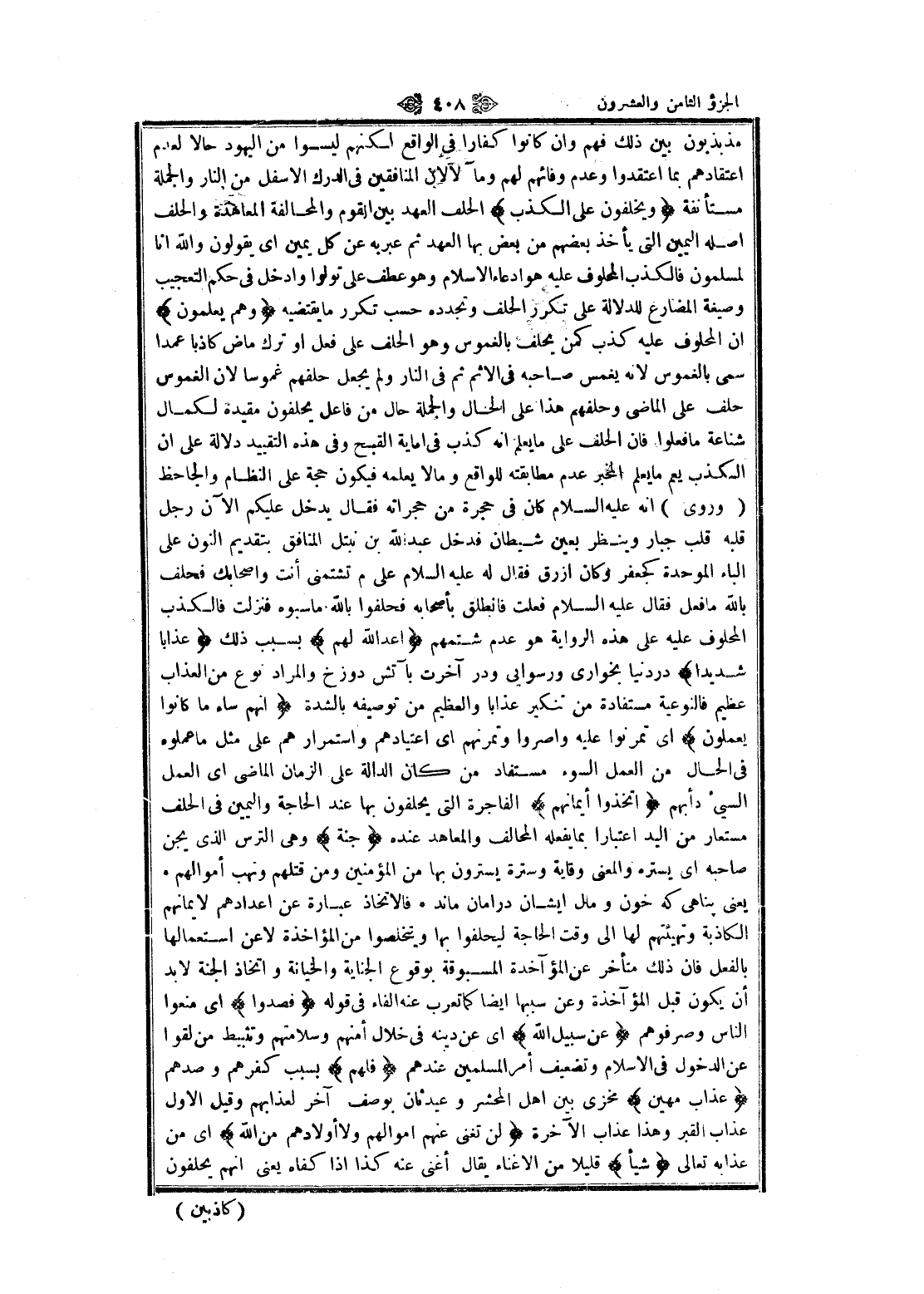 مذبذبون بين ذلك فهم وان كانوا كفارا في الواقع لكنهم ليسوا من اليهود حالا لعدم اعتقادهم بما اعتقدوا وعدم وفائهم لهم ومآلا لان المنافقين في الدرك الأسفل من النار والجملة مستأنفة وَيَحْلِفُونَ عَلَى الْكَذِبِ الحلف العهد بين القوم والمحالفة المعاهدة والحلف أصله اليمين التي يأخذ بعضهم من بعض بها العهد ثم عبريه عن كل يمين اى يقولون والله انا لمسلمون فالكذب المحلوف عليه هو ادعاء الإسلام وهو عطف على تولوا وادخل في حكم التعجيب وصيغة المضارع للدلالة على تكرر الحلف وتجدده حسب تكرر ما يقتضيه وَهُمْ يَعْلَمُونَ ان المحلوف عليه كذب كمن يحلف بالغموس وهو الحلف على فعل او ترك ماض كاذبا عمدا سمى بالغموس لانه يغمس صاحبه في الإثم ثم في النار ولم يجعل حلفهم غموسا لان الغموس حلف على الماضي وحلفهم هذا على الحال والجملة حال من فاعل يحلفون مقيدة لكمال شناعة ما فعلوا فان الحلف على ما يعلم انه كذب في غاية القبح وفي هذه التقييد دلالة على ان الكذب يعم ما يعلم المخبر عدم مطابقته للواقع ومالا يعلمه فيكون حجة على النظام والجاحظ (وروى) انه عليه السلام كان في حجرة من حجرة من حجراته فقال يدخل عليكم الآن رجل قلبه قلب جبار وينظر بعين شيطان فدخل عبد الله بن نبتل المنافق بتقديم النون على الباء الموحدة كجعفر وكان ازرق فقال له عليه السلام على م تشتمنى أنت وأصحابك فحلف بالله ما فعل فقال عليه السلام فعلت فانطلق بأصحابه فحلفوا بالله ما سبوه فنزلت فالكذب المحلوف عليه على هذه الرواية هو عدم شتمهم أَعَدَّ اللَّهُ لَهُمْ بسبب ذلك عَذاباً شَدِيداً در دنيا بخوارى ورسوايى ودر آخرت بآتش دوزخ والمراد نوع من العذاب عظيم فالنوعية مستفادة من تنكير عذابا والعظيم من توصيفه بالشدة إِنَّهُمْ ساءَ ما كانُوا يَعْمَلُونَ اى تمرنوا عليه وأصروا وتمرنهم اى اعتيادهم واستمرارهم على مثل ما عملوه فى الحال من العمل السوء مستفاد من كان الدالة على الزمان الماضي اى العمل السيئ دأبهم اتَّخَذُوا أَيْمانَهُمْ الفاجرة التي يحلفون بها عند الحاجة واليمين في الحلف مستعار من اليد اعتبارا بما يفعله المحالف والمعاهد عنده جُنَّةً وهى الترس الذي يجن صاحبه اى يستره والمعنى وقاية وسترة يسترون بها من المؤمنين ومن قتلهم ونهب أموالهم يعنى پناهى كه خون ومال ايشان در أمان ماند فالاتخاذ عبارة عن اعدادهم لايمانهم الكاذبة وتهيئتهم لها الى وقت الحاجة ليحلفوا بها ويتخلصوا من المؤاخذة لا عن استعمالها بالفعل فان ذلك متأخر عن المؤاخذة المسبوقة بوقوع الجناية والخيانة واتخاذ الجنة لا بد أن يكون قبل المؤاخذة وعن سببها ايضا كما تعرب عنه الفاء في قوله فَصَدُّوا اى منعوا الناس وصرفوهم عَنْ سَبِيلِ اللَّهِ اى عن دينه في خلال أمنهم وسلامتهم وتثبيط من لقوا عن الدخول في الإسلام وتضعيف أمر المسلمين عندهم فَلَهُمْ بسبب كفرهم وصدهم عَذابٌ مُهِينٌ مخزى بين اهل المحشر وعيد ثان بوصف آخر لعذابهم وقيل الاول عذاب القبر وهذا عذاب الآخرة لَنْ تُغْنِيَ عَنْهُمْ أَمْوالُهُمْ وَلا أَوْلادُهُمْ مِنَ اللَّهِ اى من عذابه تعالى شَيْئاً قليلا من الإغناء يقال أغنى عنه كذا إذا كفاه يعنى انهم يحلفون