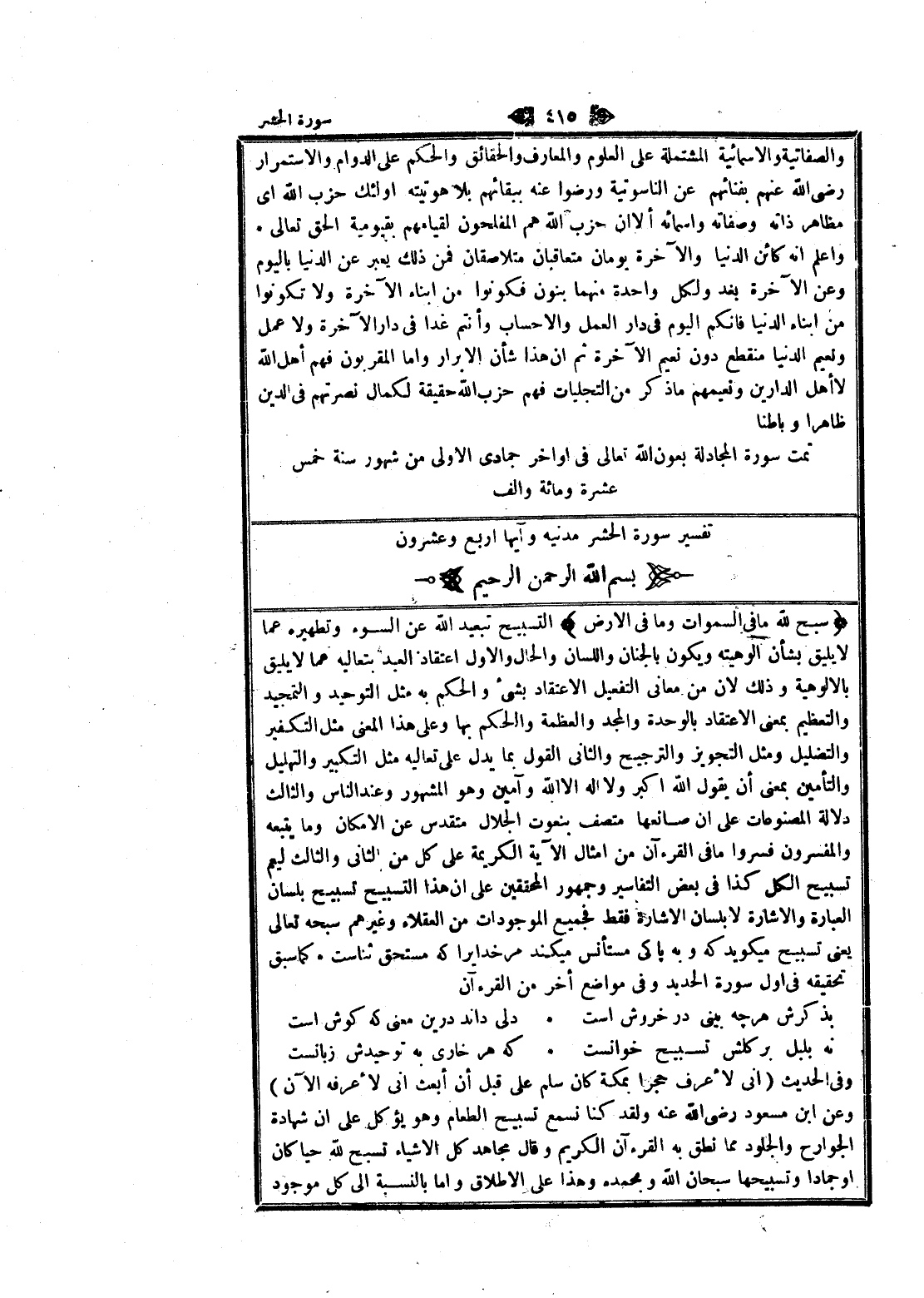 والصفاتية والاسمائية المشتملة على العلوم والمعارف والحقائق والحكم على الدوام والاستمرار رضى الله عنهم بفنائهم عن الناسوتية ورضوا عنه ببقائهم بلاهوتيته أولئك حزب الله اى مظاهر ذاته وصفاته وأسمائه ألا ان حزب الله هم المفلحون لقيامهم بقيومية الحق تعالى واعلم انه كائن الدنيا والآخرة يومان متعاقبان متلاصقان فمن ذلك يعبر عن الدنيا باليوم وعن الآخرة بغد ولكل واحدة منهما بنون فكونوا من أبناء الآخرة ولا تكونوا من أبناء الدنيا فانكم اليوم في دار العمل والاحساب وأنتم غدا في دار الآخرة ولا عمل ونعيم الدنيا منقطع دون نعيم الآخرة ثم ان هذا شأن الأبرار واما المقربون فهم أهل الله لا أهل الدارين ونعيمهم ما ذكر من التجليات فهم حزب الله حقيقة لكمال نصرتهم في الدين ظاهرا وباطنا تمت سورة المجادلة بعون الله تعالى في اواخر جمادى الاولى من شهور سنة خمس عشرة ومائة والف