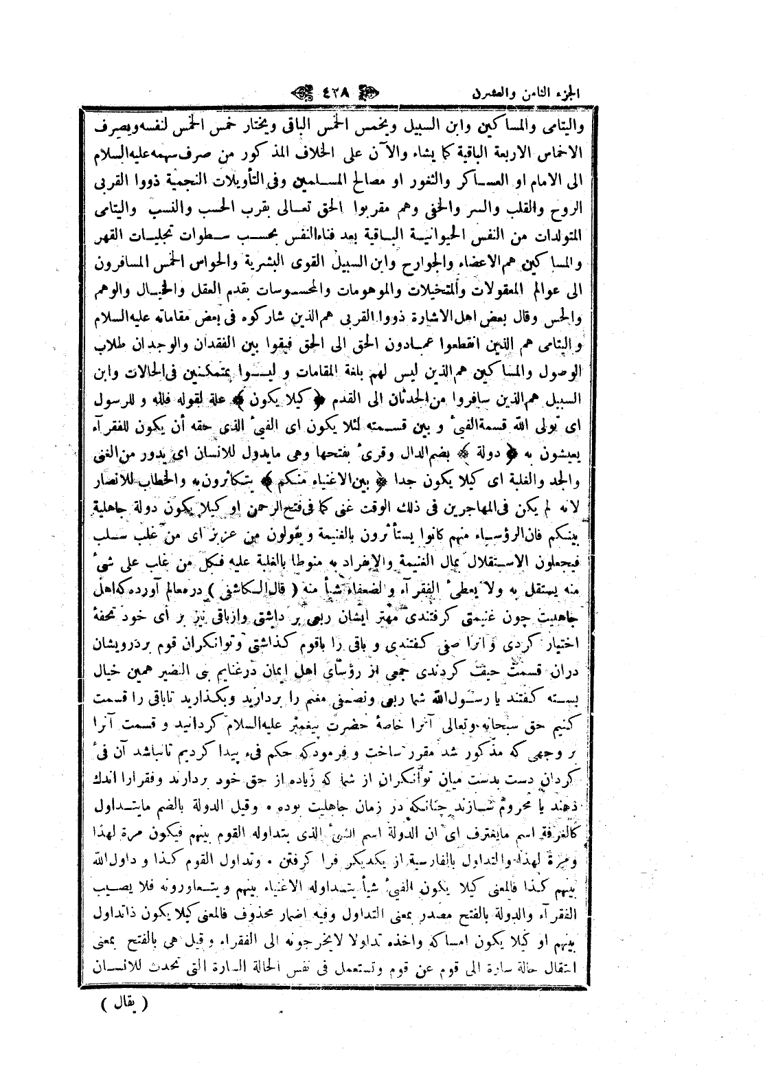 واليتامى والمساكين وابن السبيل ويخمس الخمس الباقي ويختار خمس الخمس لنفسه ويصرف الأخماس الاربعة الباقية كما يشاء والآن على الخلاف المذكور من صرف سهمه عليه السلام الى الامام او العساكر والثغور او مصالح المسلمين وفي التأويلات النجمية ذووا القربى الروح والقلب والسر والخفي وهم مقربوا الحق تعالى بقرب الحسب والنسب واليتامى المتولدات من النفس الحيوانية الباقية بعد فناء النفس بحسب سطوات تجليات القهر والمساكين هم الأعضاء والجوارح وابن السبيل القوى البشرية والحواس الخمس المسافرون الى عوالم المعقولات والمتخيلات والموهومات والمحسوسات بقدم العقل والخيال والوهم والحس وقال بعض اهل الاشارة ذووا القربى هم الذين شاركوه في بعض مقاماته عليه السلام واليتامى هم الذين انقطعوا عمادون الحق الى الحق فبقوا بين الفقدان والوجدان طلاب الوصول والمساكين هم الذين ليس لهم بلغة المقامات وليسوا بمتمكنين في الحالات وابن السبيل هم الذين سافروا من الحدثان الى القدم كَيْ لا يَكُونَ علة لقوله فلله وللرسول اى تولى الله قسمة الفيء وبين قسمته لئلا يكون اى الفيء الذي حقه أن يكون للفقرآء يعيشون به دُولَةً بضم الدال وقرئ بفتحها وهى ما يدول للانسان اى يدور من الغنى والجد والغلبة اى كيلا يكون جدا بَيْنَ الْأَغْنِياءِ مِنْكُمْ يتكاثرون به والخطاب للانصار لانه لم يكن في المهاجرين في ذلك الوقت غنى كما في فتح الرحمن او كيلا يكون دولة جاهلية بينكم فان الرؤساء منهم كانوا يستأثرون بالغنيمة ويقولون من عزيز اى من غلب سلب فيجعلون الاستقلال بمال الغنيمة والانفراد به منوطا بالغلبة عليه فكل من غلب على شيء منه يستقل به ولا يعطئ الفقراء والضعفاء شيأ منه (قال الكاشفى) در معالم آورده كه اهل جاهليت چون غنيمتى كرفتندى مهتر ايشان ربعى بر داشتى واز باقى نيز براى خود تحفه اختيار كردى وانرا صفى كفتندى وباقى را با قوم كذاشتى وتوانكران قوم بر درويشان در