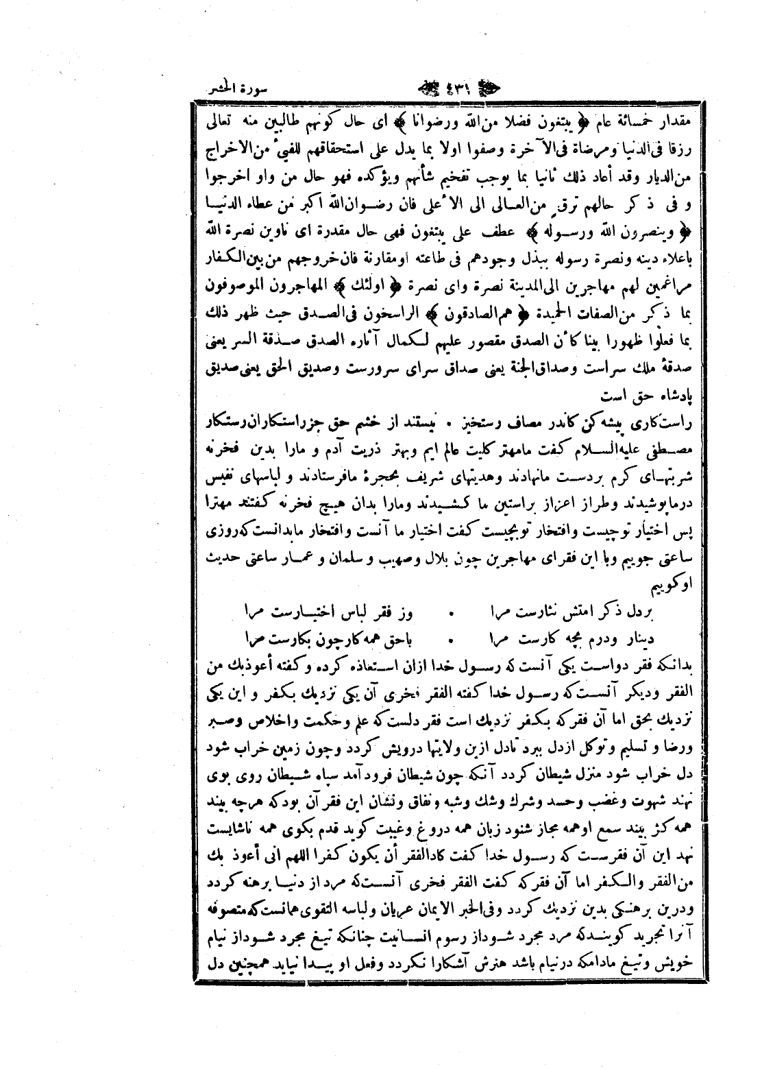 مقدار خمسائة عام يَبْتَغُونَ فَضْلًا مِنَ اللَّهِ وَرِضْواناً اى حال كونهم طالبين منه تعالى رزقا في الدنيا ومرضاة في الآخرة وصفوا اولا بما يدل على استحقاقهم للفيئ من الإخراج من الديار وقد أعاد ذلك ثانيا بما يوجب تفخيم شأنهم ويؤكده فهو حال من واو اخرجوا وفي ذكر حالهم ترق من العالي الى الأعلى فان رضوان الله اكبر من عطاء الدنيا وَيَنْصُرُونَ اللَّهَ وَرَسُولَهُ عطف على يبتغون فهى حال مقدرة اى ناوين نصرة الله بإعلاء دينه ونصرة رسوله ببذل وجودهم في طاعته او مقارنة فان خروجهم من بين الكفار مراغمين لهم مهاجرين الى المدينة نصرة واى نصرة أُولئِكَ المهاجرون الموصوفون بما ذكر من الصفات الحميدة هُمُ الصَّادِقُونَ الراسخون في الصدق حيث ظهر ذلك بما فعلوا ظهورا بينا كأن الصدق مقصور عليهم لكمال آثاره الصدق صدقة السر يعنى صدقه ملك سر است وصداق الجنة يعنى صداق سراى سرورست وصديق الحق يعنى صديق پادشاه حق است