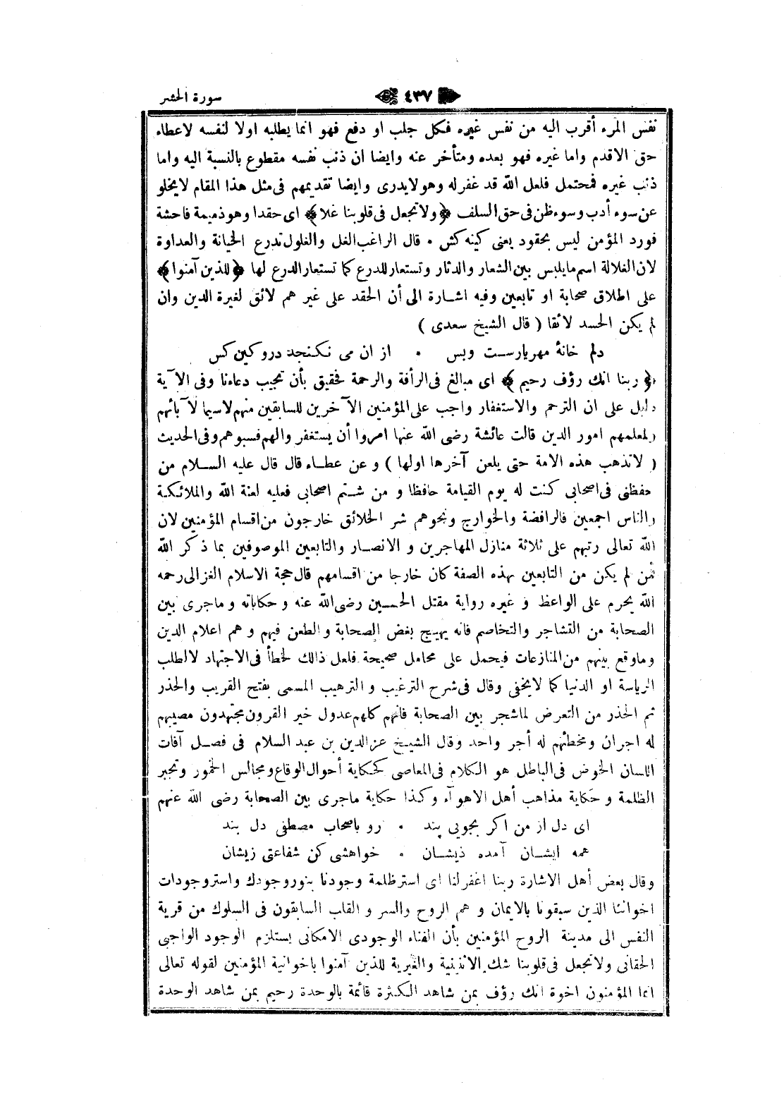 رَبَّنا إِنَّكَ رَؤُفٌ رَحِيمٌ اى مبالغ في الرأفة والرحمة فحقيق بأن تجيب دعاءنا وفي الآية دليل على ان الترحم والاستغفار واجب على المؤمنين الآخرين للسابقين منهم لا سيما لآبائهم ولمعلمهم امور الدين قالت عائشة رضى الله عنها أمروا أن يستغفر والهم فسبوهم وفي الحديث (لا تذهب هذه الامة حتى يلعن آخرها أولها) وعن عطاء قال قال عليه السلام من حفظنى في أصحابي كنت له يوم القيامة حافظا ومن شتم أصحابي فعليه لعنة الله والملائكة والناس أجمعين فالرافضة والخوارج ونحوهم شر الخلائق خارجون من اقسام المؤمنين لان الله تعالى رتبهم على ثلاثة منازل المهاجرين والأنصار والتابعين الموصوفين بما ذكر الله فمن لم يكن من التابعين بهذه الصفة كان خارجا من اقسامهم قال حجة الإسلام الغزالي رحمه الله يحرم على الواعظ وغيره رواية مقتل الحسين رضى الله عنه وحكاياته وما جرى بين الصحابة من التشاجر والتخاصم فانه يهيج بغض الصحابة والطعن فيهم وهم اعلام الدين وما وقع بينهم من المنازعات فيحمل على محامل صحيحة فلعل ذالك لخطأ في الاجتهاد لا لطلب الرياسة او الدنيا كما لا يخفى وقال في شرح الترغيب والترهيب المسمى بفتح القريب والحذر ثم الحذر من التعرض لما شجر بين الصحابة فانهم كلهم عدول خير القرون مجتهدون مصيبهم له أجران ومخطئهم له أجر واحد وقال الشيخ عز الدين بن عبد السلام في فصل آفات اللسان الخوض في الباطل هو الكلام في المعاصي كحكاية أحوال الوقاع ومجالس الخمور وتجبر الظلمة وحكاية مذاهب أهل الأهواء وكذا