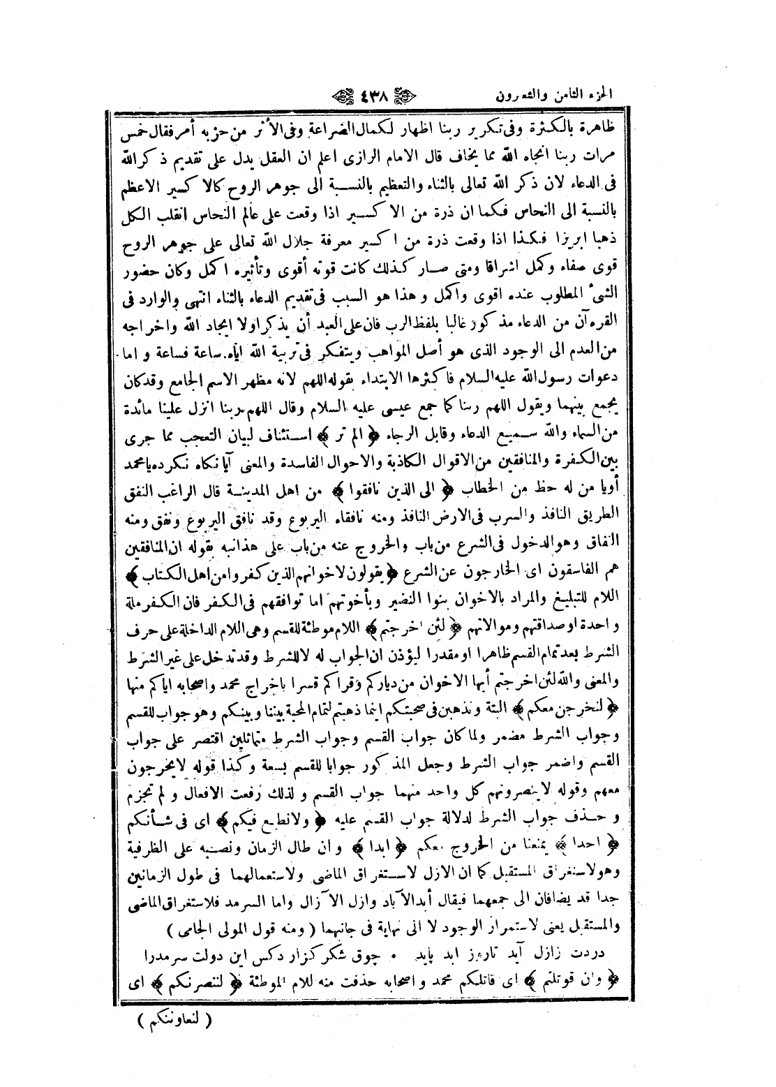 ظاهرة بالكثرة وفي تكرير ربنا اظهار لكمال الضراعة وفي الأثر من حزبه أمر فقال خمس مرات ربنا أنجاه الله مما يخاف قال الامام الرازي اعلم ان العقل يدل على تقديم ذكر الله فى الدعاء لان ذكر الله تعالى بالثناء والتعظيم بالنسبة الى جوهر الروح كالاكسير الأعظم بالنسبة الى النحاس فكما ان ذرة من الإكسير إذا وقعت على عالم النحاس انقلب الكل ذهبا إبريزا فكذا إذا وقعت ذرة من اكسير معرفة جلال الله تعالى على جوهر الروح قوى صفاء وكمل إشراقا ومتى صار كذلك كانت قوته أقوى وتأثيره أكمل وكان حضور الشيء المطلوب عنده أقوى وأكمل وهذا هو السبب في تقديم الدعاء بالثناء انتهى والوارد في القرآن من الدعاء مذكور غالبا بلفظ الرب فان على العبد أن يذكر اولا إيجاد الله وإخراجه من العدم الى الوجود الذي هو أصل المواهب ويتفكر في تربية الله إياه ساعة فساعة واما دعوات رسول الله عليه السلام فاكثرها الابتداء بقوله اللهم لانه مظهر الاسم الجامع وقد كان يجمع بينهما ويقول اللهم ربنا كما جمع عيسى عليه السلام وقال اللهم ربنا انزل علينا مائدة من السماء والله سميع الدعاء وقابل الرجاء أَلَمْ تَرَ استئناف لبيان التعجب مما جرى بين الكفرة والمنافقين من الأقوال الكاذبة والأحوال الفاسدة والمعنى آيا نكاه نكرده يا محمد أو يا من له حظ من الخطاب إِلَى الَّذِينَ نافَقُوا من اهل المدينة قال الراغب النفق الطريق النافذ والسرب في الأرض النافذ ومنه نافقا اليربوع وقد نافق اليربوع ونفق ومنه النفاق وهو الدخول في الشرع من باب والخروج عنه من باب على هذانبه بقوله ان المنافقين هم الفاسقون اى الخارجون عن الشرع يَقُولُونَ لِإِخْوانِهِمُ الَّذِينَ كَفَرُوا مِنْ أَهْلِ الْكِتابِ اللام للتبليغ والمراد بالاخوان بنوا النضير وبأخوتهم اما توافقهم في الكفر فان الكفر ملة واحدة او صداقتهم وموالاتهم لَئِنْ أُخْرِجْتُمْ اللام موطئة للقسم وهى اللام الداخلة على حرف الشرط بعد تمام القسم ظاهرا او مقدرا ليؤذن ان الجواب له لا للشرط وقد تدخل على غير الشرط والمعنى والله لئن أخرجتم أيها الاخوان من دياركم وقراكم قسرا بإخراج محمد وأصحابه إياكم منها لَنَخْرُجَنَّ مَعَكُمْ البتة ونذهبن في صحبتكم أينما ذهبتم لتمام المحبة بيننا وبينكم وهو جواب للقسم وجواب الشرط مضمر ولما كان جواب القسم وجواب الشرط متماثلين اقتصر على جواب القسم وأضمر جواب الشرط وجعل المذكور جوابا للقسم بسعة وكذا قوله لا يخرجون معهم وقوله لا ينصرونهم كل واحد منهما جواب القسم ولذلك رفعت الافعال ولم تجزم وحذف جواب الشرط لدلالة جواب القسم عليه وَلا نُطِيعُ فِيكُمْ اى في شأنكم أَحَداً يمنعنا من الخروج معكم أَبَداً وان طال الزمان ونصبه على الظرفية وهو لاستغراق المستقبل كما ان الأزل لاستغراق الماضي ولاستعمالهما في طول الزمانين جدا قد يضافان الى جمعهما فيقال أبد الآباد وازل الآزال واما السرمد فلاستغراق الماضي والمستقبل يعنى لاستمرار الوجود لا الى نهاية في جانبهما (ومنه قول المولى الجامى)