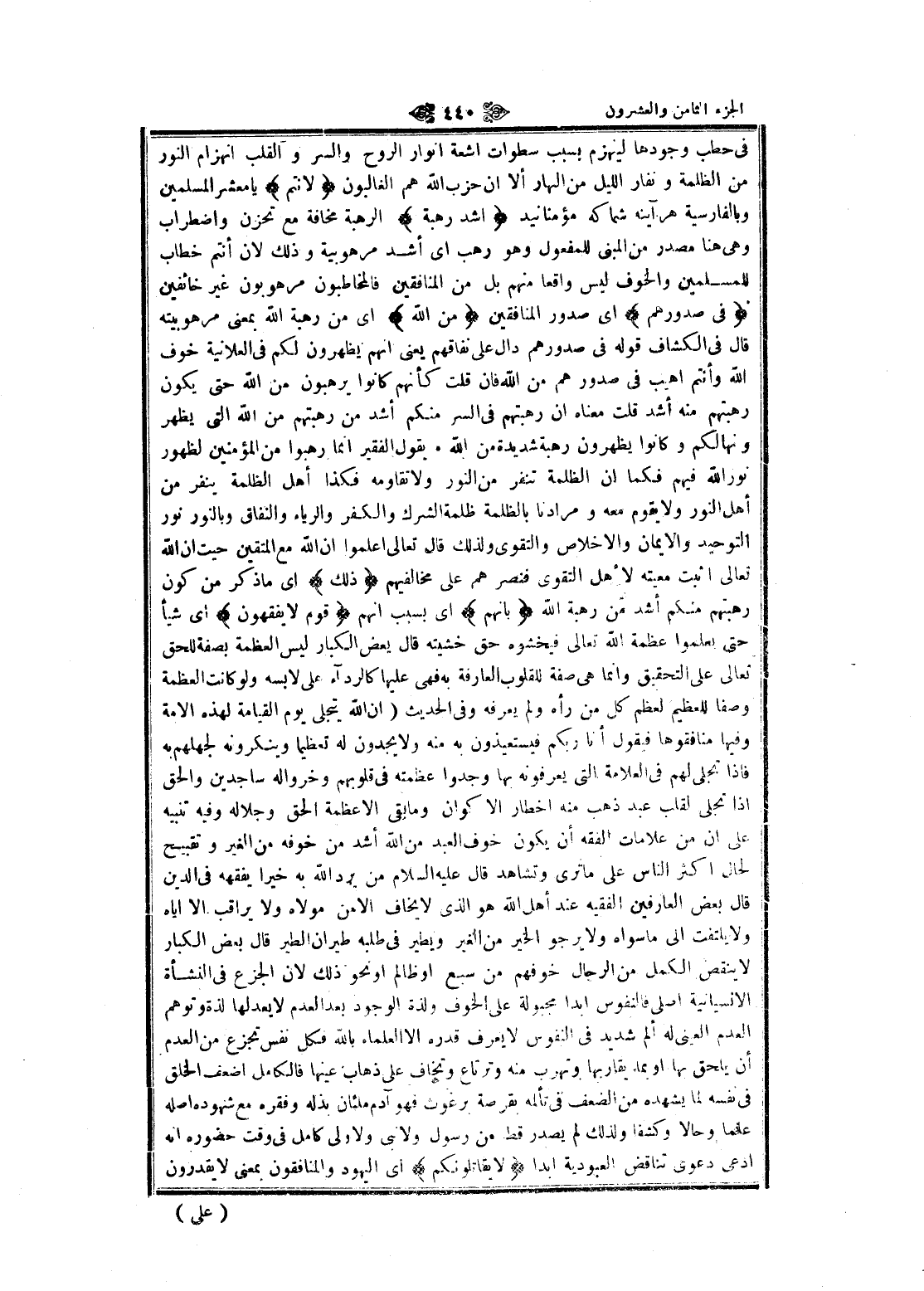 فى حطب وجودها لينهزم بسبب سطوات أشعة أنوار الروح والسر والقلب انهزام النور من الظلمة ونفار الليل من النهار ألا ان حزب الله هم الغالبون لَأَنْتُمْ يا معشر المسلمين وبالفارسية هر آينه شما كه مؤمنانيد أَشَدُّ رَهْبَةً الرهبة مخافة مع تحزن واضطراب وهى هنا مصدر من المبنى للمفعول وهو رهب اى أشد مرهوبية وذلك لان أنتم خطاب للمسلمين والخوف ليس واقعا منهم بل من المنافقين فالمخاطبون مرهوبون غير خائفين فِي صُدُورِهِمْ اى صدور المنافقين مِنَ اللَّهِ اى من رهبة الله بمعنى مرهوبيته قال في الكشاف قوله في صدورهم دال على نفاقهم يعنى انهم يظهرون لكم في العلانية خوف الله وأنتم اهيب في صدورهم من الله فان قلت كأنهم كانوا يرهبون من الله حتى يكون رهبتهم منه أشد قلت معناه ان رهبتهم في السر منكم أشد من رهبتهم من الله التي يظهر ونهالكم وكانوا يظهرون رهبة شديدة من الله يقول الفقير انما رهبوا من المؤمنين لظهور نور الله فيهم فكما ان الظلمة تنفر من النور ولا تقاومه فكذا أهل الظلمة ينفر من أهل النور ولا يقوم معه ومرادنا بالظلمة ظلمة الشرك والكفر والرياء والنفاق وبالنور نور التوحيد والايمان والإخلاص والتقوى ولذلك قال تعالى اعلموا ان الله مع المتقين حيث ان الله تعالى اثبت معيته لأهل التقوى فنصرهم على مخالفيهم ذلِكَ اى ما ذكر من كون رهبتهم منكم أشد من رهبة الله بِأَنَّهُمْ اى بسبب انهم قَوْمٌ لا يَفْقَهُونَ اى شيأ حتى يعلموا عظمة الله تعالى فيخشوه حق خشيته قال يعض الكبار ليس العظمة بصفة للحق تعالى على التحقيق وانما هى صفة للقلوب العارفة به فهى عليها كالردآء على لابسه ولو كانت العظمة وصفا للعظيم لعظم كل من رأه ولم يعرفه وفي الحديث (ان الله يتجلى يوم القيامة لهذه الامة وفيها منافقوها فيقول أنا ربكم فيستعيذون به منه ولا يجدون له تعظيما وينكرونه لجهلهم به فاذا تجلى لهم في العلامة التي يعرفونه بها وجدوا عظمته في قلوبهم وخرواله ساجدين والحق إذا تجلى لقلب عبد ذهب منه اخطار الأكوان وما بقي إلا عظمة الحق وجلاله وفيه تنبيه على ان من علامات الفقه أن يكون خوف العبد من الله أشد من خوفه من الغير وتقبيح لحال اكثر الناس على ما ترى وتشاهد قال عليه السلام من يرد الله به خيرا يفقهه في الدين قال بعض العارفين الفقيه عند أهل الله هو الذي لا يخاف الا من مولاه ولا يراقب الا إياه ولا يلتفت الى ما سواه ولا يرجو الخير من الغير ويطير في طلبه طيران الطير قال بعض الكبار لا ينقص الكمل من الرجال خوفهم من سبع او ظالم او نحو ذلك لان الجزع في النشأة الإنسانية أصلي فالنفوس ابدا مجبولة على الخوف ولذة الوجود بعد العدم لا يعدلها لذة وتوهم العدم العيني له ألم شديد في النفوس لا يعرف قدره الا العلماء بالله فكل نفس تجزع من العدم أن يلحق بها او بما يقاربها وتهرب منه وترتاع وتخاف على ذهاب عينها فالكامل أضعف الخلق فى نفسه لما يشهده من الضعف في تألمه بقرصة برغوث فهو آدم ملئان بذله وفقره مع شهوده أصله علما وحالا وكشفا ولذلك لم يصدر قط من رسول ولا نبى ولاولى كامل في وقت حضوره انه ادعى دعوى تناقض العبودية ابدا لا يُقاتِلُونَكُمْ اى اليهود والمنافقون بمعنى لا يقدرون