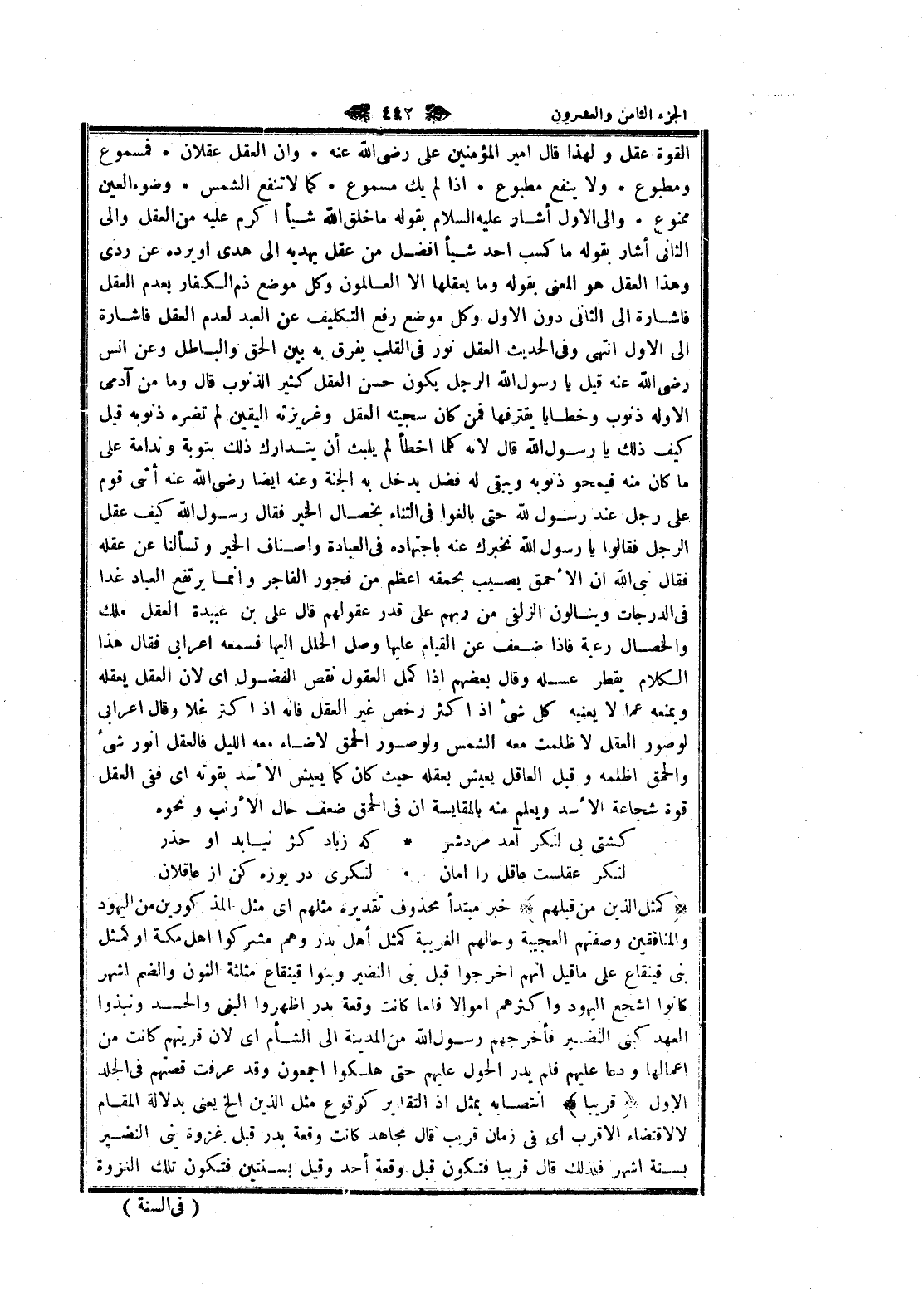 القوة عقل ولهذا قال امير المؤمنين على رضى الله عنه وان العقل عقلان فمسموع ومطبوع ولا ينفع مطبوع إذا لم يك مسموع كما لا تنفع الشمس وضوء العين ممنوع والى الاول أشار عليه السلام بقوله ما خلق الله شيأ أكرم عليه من العقل والى الثاني أشار بقوله ما كسب أحد شيأ أفضل من عقل يهديه الى هدى او يرده عن ردى وهذا العقل هو المعنى بقوله وما يعقلها الا العالمون وكل موضع ذم الكفار بعدم العقل فاشارة الى الثاني دون الاول وكل موضع رفع التكليف عن العبد لعدم العقل فاشارة الى الاول انتهى وفي الحديث العقل نور في القلب يفرق به بين الحق والباطل وعن انس رضى الله عنه قيل يا رسول الله الرجل يكون حسن العقل كثير الذنوب قال وما من آدمي الا وله ذنوب وخطايا يقترفها فمن كان سجيته العقل وغريزته اليقين لم تضره ذنوبه قيل كيف ذلك يا رسول الله قال لانه كلما اخطأ لم يلبث أن يتدارك ذلك بتوبة وندامة على ما كان منه فيمحو ذنوبه ويبقى له فضل يدخل به الجنة وعنه ايضا رضى الله عنه أثنى قوم على رجل عند رسول الله حتى بالغوا في الثناء بخصال الخير فقال رسول الله كيف عقل الرجل فقالوا يا رسول الله نخبرك عنه باجتهاده في العبادة واصناف الخير وتسألنا عن عقله فقال نبى الله ان الأحمق يصيب بحمقه أعظم من فجور الفاجر وانما يرتفع العباد غدا فى الدرجات وينالون الزلفى من ربهم على قدر عقولهم قال على بن عبيدة العقل ملك والخصال رعية فاذا ضعف عن القيام عليها وصل الخلل إليها فسمعه أعرابي فقال هذا الكلام يقطر عسله وقال بعضهم إذا كمل العقول نقص الفضول اى لان العقل يعقله ويمنعه عما لا يعنيه كل شيء إذا اكثر رخص غير العقل فانه إذ اكثر غلا وقال أعرابي لو صور العقل لا ظلمت معه الشمس ولو صور الحمق لاضاء معه الليل فالعقل أنور شيء والحمق أظلمه وقبل العاقل يعيش بعقله حيث كان كما يعيش الأسد بقوته اى ففى العقل قوة شجاعة الأسد ويعلم منه بالمقايسة ان في الحمق ضعف حال الأرنب ونحوه