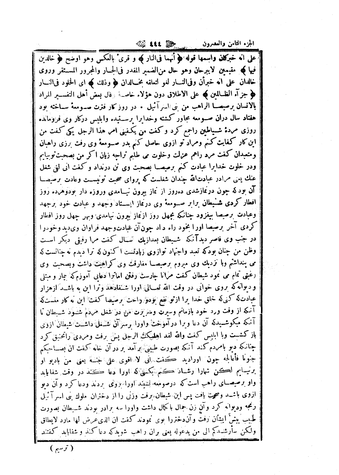 على انه خبر كان واسمها قوله أَنَّهُما فِي النَّارِ وقرئ بالعكس وهو أوضح خالِدَيْنِ فِيها مقيمين لا يبرحان وهو حال من الضمير المقدر في الجار والمجرور المستقر وروى خالدان على انه خبر أن وفي النار لغو لتعلقه بخالدان وَذلِكَ اى الخلود في النار جَزاءُ الظَّالِمِينَ على الإطلاق دون هؤلاء خاصة وقال بعض أهل التفسير المراد بالإنسان برصيصا الراهب من بنى إسرائيل در روزگار فترت صومعه ساخته بود هفتاد سال در ان صومعه مجاور كشته وخدايرا پرستيده وإبليس در كار وى فرو مانده روزى مرده شياطين را جمع كرد وكفت من يكفينى امر هذا الرجل يكى كفت من اين كار كفايت كنم ومراد تو از وى حاصل كنم بدر صومعه وى رفت برزى راهبان ومتعبدان كفت مرد را هم عزلت وخلوت مى طلبم ترا چهـ زيان اگر من بصحبت تو بيايم ودر خلوت خدايرا عبادت كنم برصيصا بصحبت وى تن در نداد وكفت انى لفى شغل عنك يعنى مرا در عبادت الله چندان شغلست كه پرواى صحبت تو نيست وعادت