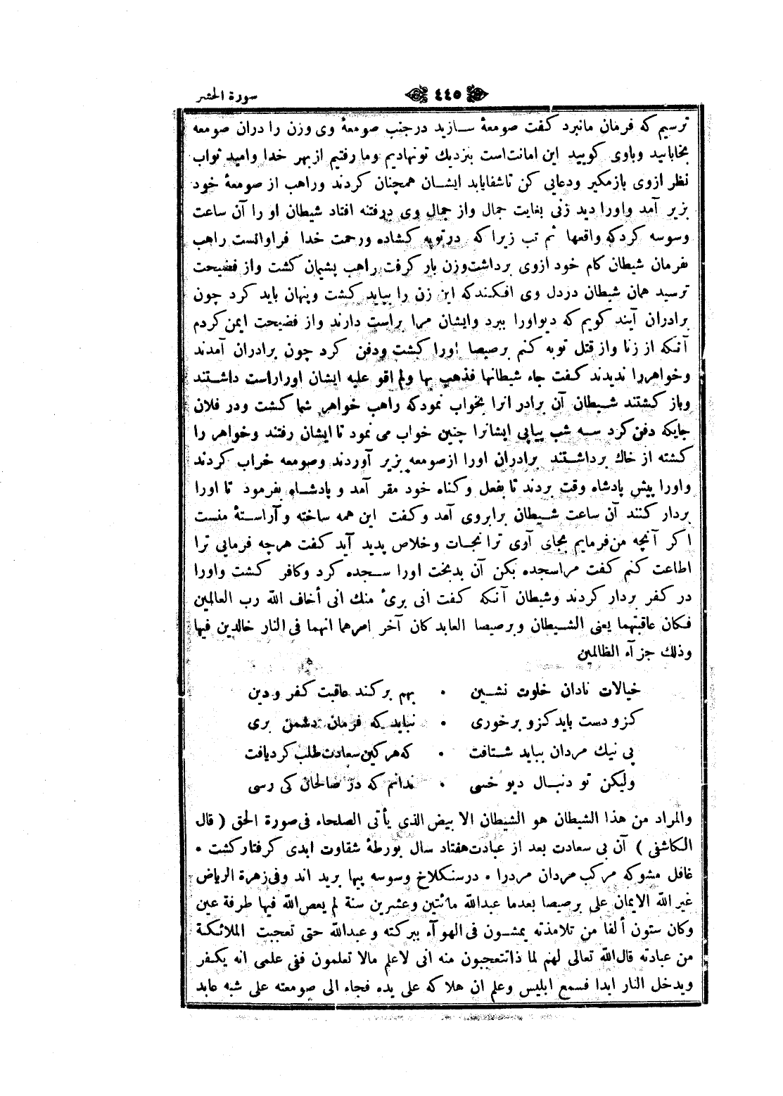 والمراد من هذا الشيطان هو الشيطان الأبيض الذي يأتى الصلحاء في صورة الحق (قال الكاشفى) آن بى سعادت بعد از عبادت هفتاد سال بورطه شقاوت أبدى گرفتار گشت