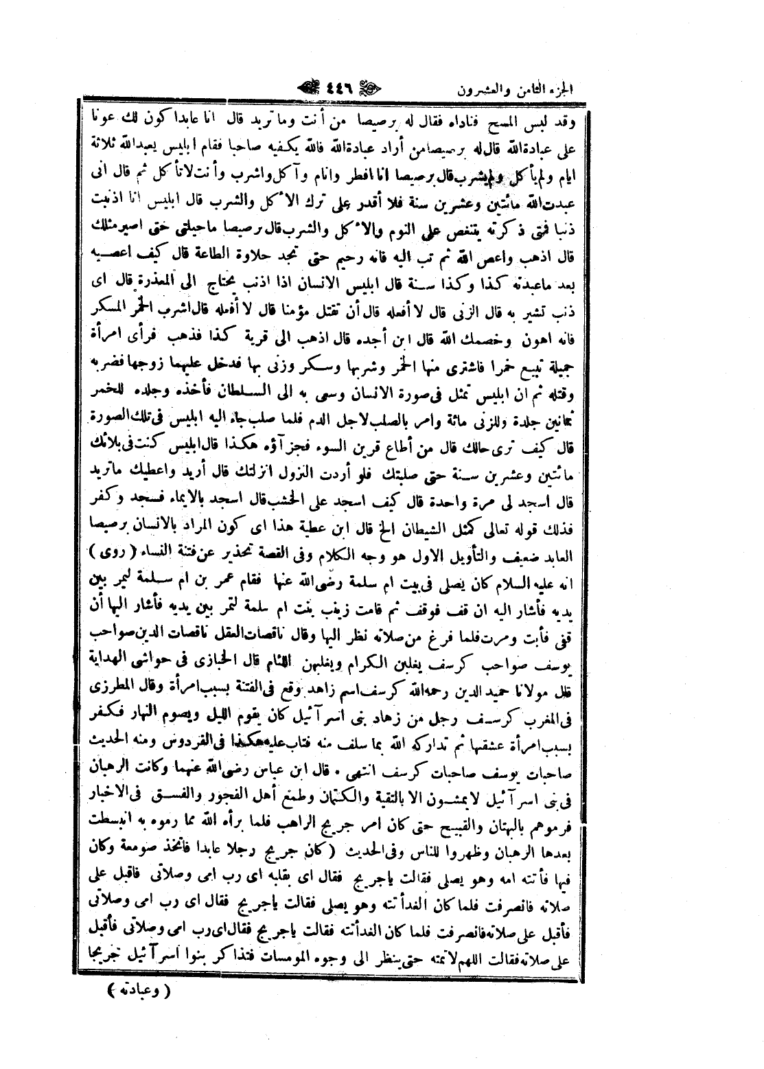 وقد لبس المسح فناداه فقال له برصيصا من أنت وما تريد قال انا عابد أكون لك عونا على عبادة الله قال له برصيصا من أراد عبادة الله فالله يكفيه صاحبا فقام إبليس يعبد الله ثلاثة ايام ولم يأكل ولم يشرب قال برصيصا انا أفطر وأنام وآكل واشرب وأنت لا تأكل ثم قال انى عبدت الله مائتين وعشرين سنة فلا أقدر على ترك الأكل والشرب قال إبليس انا أذنبت ذنبا فمتى ذكرته يتنغص على النوم والأكل والشرب قال برصيصا ما حيلتى حتى أصير مثلك قال اذهب واعص الله ثم تب اليه فانه رحيم حتى تجد حلاوة الطاعة قال كيف أعصيه بعد ما عبدته كذا وكذا سنة قال إبليس الإنسان إذا أذنب يحتاج الى المعذرة قال اى ذنب تشير به قال الزنى قال لا أفعله قال أن تقتل مؤمنا قال لا أفعله قال اشرب الخمر المسكر فانه أهون وخصمك الله قال ابن أجده قال اذهب الى قرية كذا فذهب فرأى امرأة جميلة تبيع خمرا فاشترى منها الخمر وشربها وسكر وزنى بها فدخل عليهما زوجها فضربه وقتله ثم ان إبليس تمثل في صورة الإنسان وسعى به الى السلطان فأخذه وجلده للخمر ثمانين جلدة وللزنى مائة وامر بالصلب لاجل الدم فلما صلب جاء اليه إبليس في تلك الصورة قال كيف ترى حالك قال من أطاع قرين السوء فجزآؤه هكذا قال إبليس كنت في بلائك مائتين وعشرين سنة حتى صلبتك فلو أردت النزول انزلتك قال أريد وأعطيك ما تريد قال اسجد لى مرة واحدة قال كيف اسجد على الخشب قال اسجد بالإيماء فسجد وكفر فذلك قوله تعالى كمثل الشيطان إلخ قال ابن عطية هذا اى كون المراد بالإنسان برصيصا العابد ضعيف والتأويل الاول هو وجه الكلام وفي القصة تحذير عن فتنة النساء (روى) انه عليه السلام كان يصلى في بيت أم سلمة رضى الله عنها فقام عمر بن أم سلمة ليمر بين يديه فأشار اليه ان قف فوقف ثم قامت زينب بنت أم سلمة لتمر بين يديه فأشار إليها أن قفى فأبت ومرت فلما فرغ من صلاته نظر إليها وقال ناقصات العقل ناقصات الدين صواحب يوسف صواحب كرسف يغلبن الكرام ويغلبهن اللئام قال الخبازى في حواشى الهداية قال مولانا حميد الدين رحمه الله كرسف اسم زاهد وقع في الفتنة بسبب امرأة وقال المطرزي فى المغرب كرسف رجل من زهاد بنى إسرائيل كان يقوم الليل ويصوم النهار فكفر بسبب امرأة عشقها ثم تداركه الله بما سلف منه فتاب عليه هكذا في الفردوس ومنه الحديث صاحبات يوسف صاحبات كرسف انتهى قال ابن عباس رضى الله عنهما وكانت الرهبان فى بنى إسرائيل لا يمشون الا بالتقية والكتمان وطمع أهل الفجور والفسق في الاخبار فرموهم بالبهتان والقبيح حتى كان امر جريج الراهب فلما برأه الله مما رموه به انبسطت بعدها الرهبان وظهروا للناس وفي الحديث (كان جريج رجلا عابدا فاتخذ صومعة وكان فيها فأتته امه وهو يصلى فقالت يا جريج فقال اى بقلبه اى رب أمي وصلاتى فاقبل على صلاته فانصرفت فلما كان الغداة وهو يصلى فقالت يا جريج فقال اى رب أمي وصلاتى فأقبل على صلاته فانصرفت فلما كان الغداة فقالت يا جريج فقال اى رب أمي وصلاتى فأقبل على صلاته فقالت اللهم لا تمته حتى ينظر الى وجوه المومسات فتذاكر بنو إسرائيل جريجا