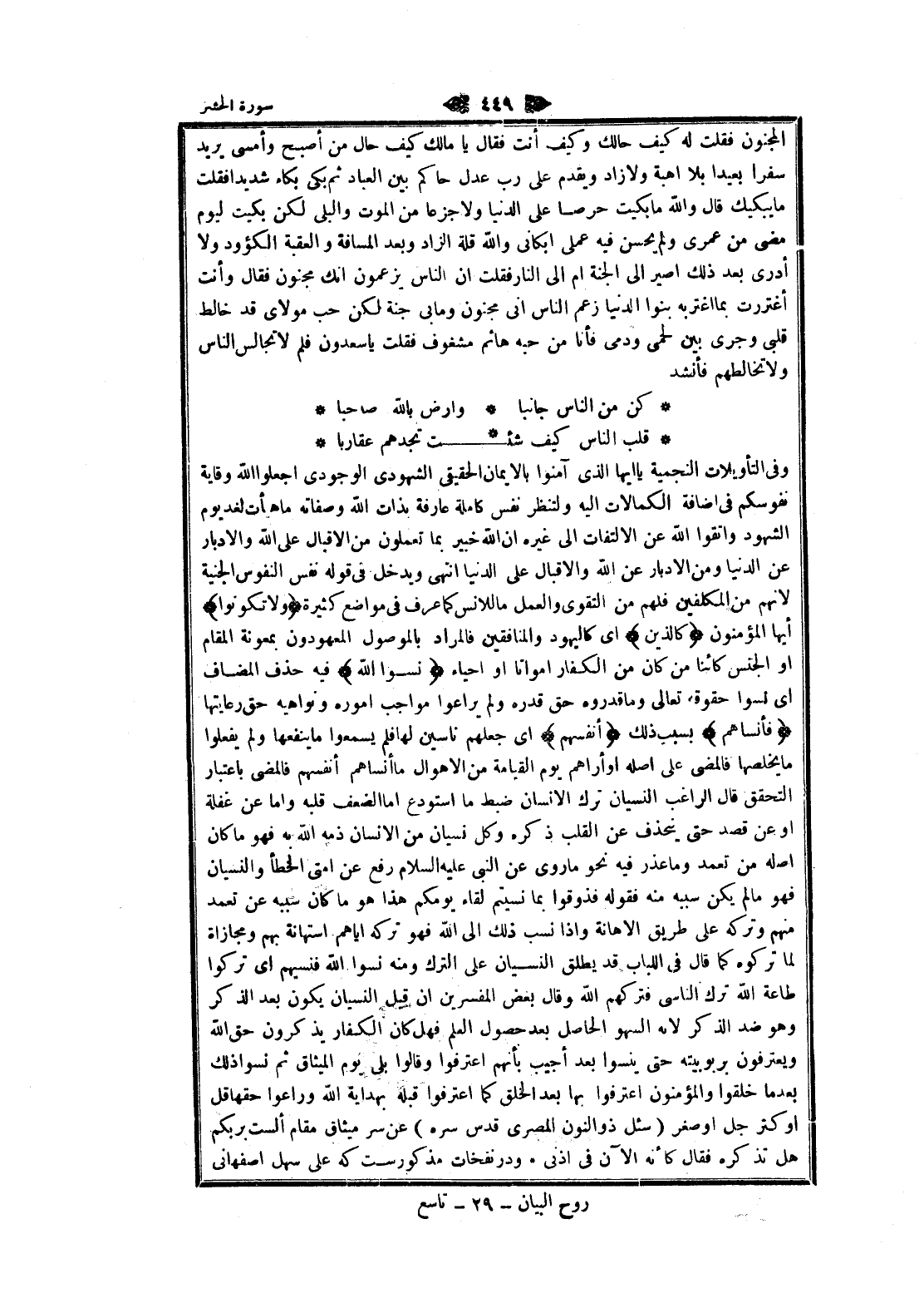 المجنون فقلت له كيف حالك وكيف أنت فقال يا مالك كيف حال من أصبح وأمسى يريد سفرا بعيدا بلا اهبة ولا زاد ويقدم على رب عدل حاكم بين العباد ثم بكى بكاء شديدا فقلت ما يبكيك قال والله ما بكيت حرصا على الدنيا ولا جزعا من الموت والبلى لكن بكيت ليوم مضى من عمرى ولم يحسن فيه عملى أبكاني والله قلة الزاد وبعد المسافة والعقبة الكؤود ولا أدرى بعد ذلك أصير الى الجنة أم الى النار فقلت ان الناس يزعمون انك مجنون فقال وأنت اغتررت بما اغتر به بنو الدنيا زعم الناس انى مجنون ومابى جنة لكن حب مولاى قد خالط قلبى وجرى بين لحمى ودمى فأنا من حبه هائم مشغوف فقلت يا سعدون فلم لا تجالس الناس ولا تخالطهم فأنشد
