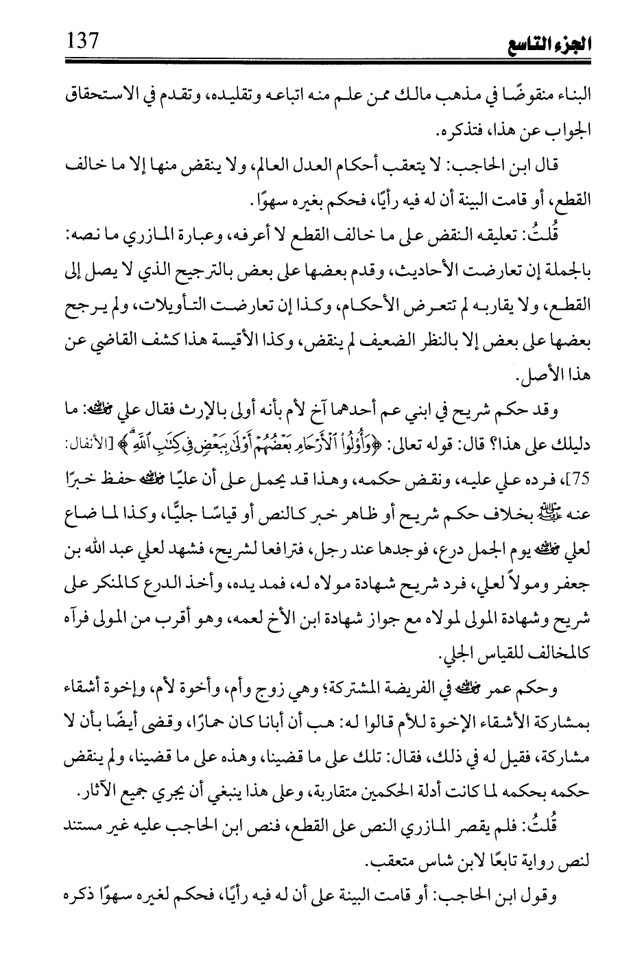 وقد حكم شريح في ابني عم أحدهما آخ لأم بأنه أولى بالإرث فقال علي رضى الله عنه: ما دليلك على هذا؟ قال: قوله تعالى: {وأُوْلُوا الأَرْحَامِ بَعْضُهُمْ أَوْلَى بِبَعْضٍ فِي كِتَابِ اللَّهِ} [الأنفال: 75]، فرده علي عليه، ونقض حكمه، وهذا قد يحمل على أن عليًا رضى الله عنه حفظ خبرًا عنه صلى الله عليه وسلم بخلاف حكم شريح أو ظاهر خبر كالنص أو قياسًا جليًا، وكذا لما ضاع لعلي رضى الله عنه يوم الجمل درع، فوجدها عند رجل، فترافعا لشريح، فشهد لعلي عبد الله بن جعفر ومولًا لعلي، فرد شريح شهادة مولاه له، فمديده، وأخذ الدرع كالمنكر على شريح وشهادة المولى لمولاه مع جواز شهادة ابن الأخ لعمه، وهو أقرب من المولى فرآه كالمخالف للقياس الجلي.
