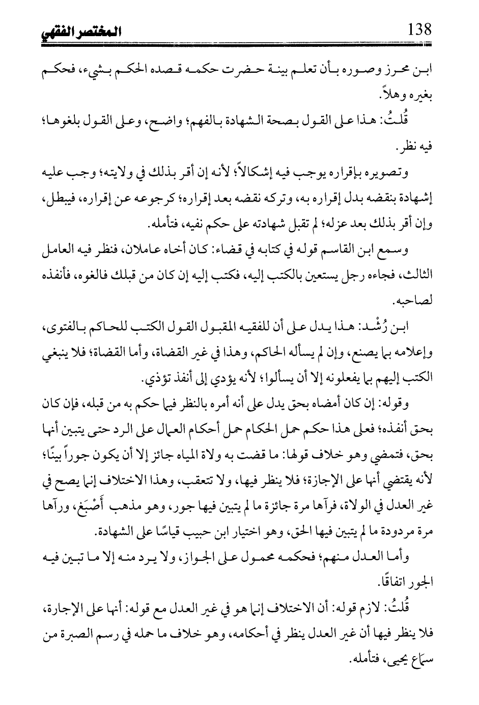 وقوله: إن كان أمضاه بحق يدل على أنه أمره بالنظر فيما حكم به من قبله، فإن كان بحق أنقذه؛ فعلى هذا حكم حمل الحكام حمل أحكام العمال على الرد حتى يتبين أنها بحق، فتمضي وهو خلاف قولها: ما قضت به ولاة المياه جائز إلا أن يكون جورًا بينًا؛ لأنه يقتضي أنها على الإجارة؛ فلا ينظر فيها، ولا تتعقب، وهذا الاختلاف لإنما يصح في غير العدل في الولاة، فرآها مرة جائزة ما لم يتبين فيها جور، وهو مذهب أصبغ، ورآها مرة مردودة ما لم يتبين فيها الحق، وهو اختيار ابن حبيب قياسًا على الشهادة.