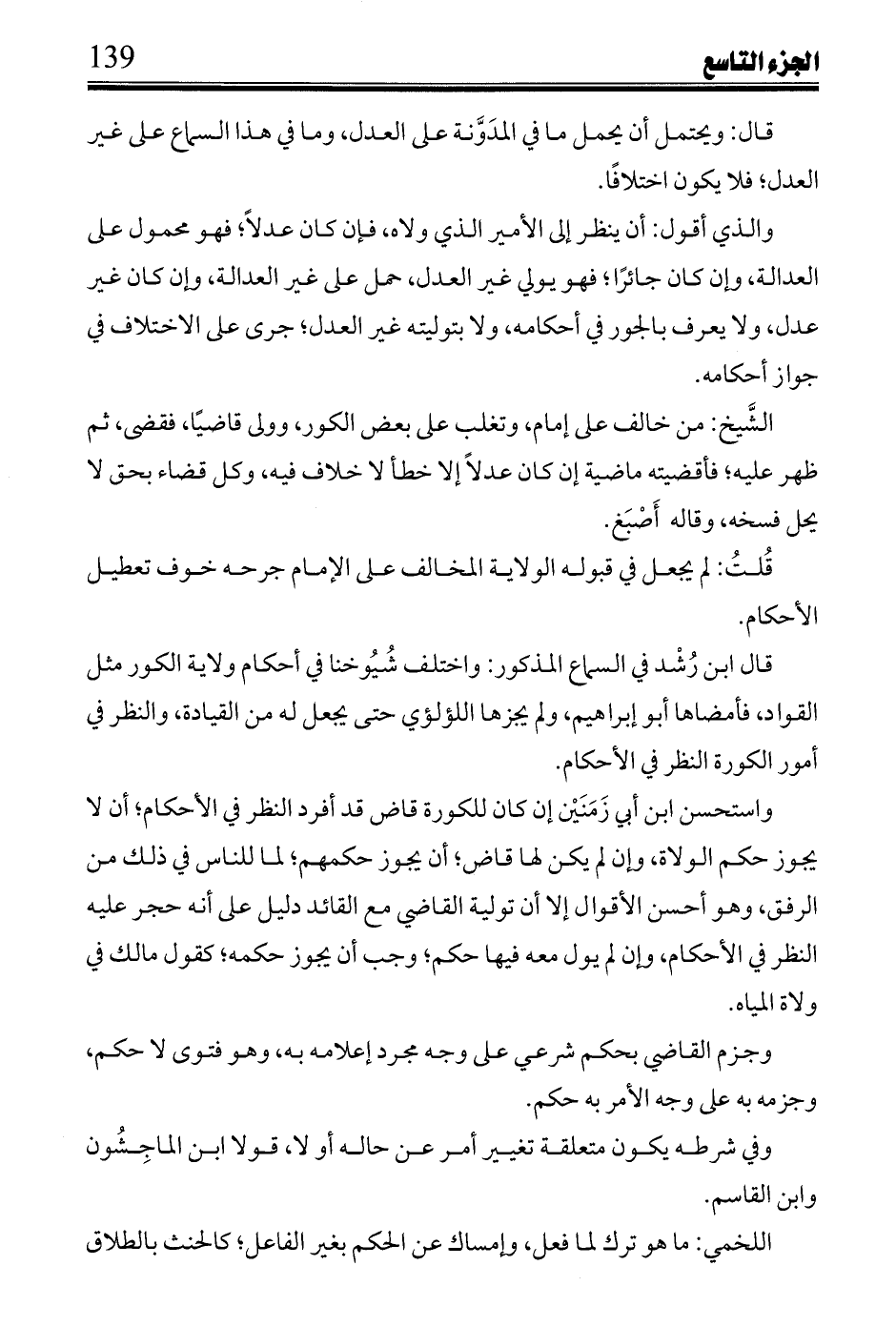 قال ابن رشد في السماع المذكور: واختلف شيوخنا في أحكام ولاية الكور مثل القواد، فأمضاها أبو إبراهيم، ولم يجزها اللؤلؤي حتى يجعل له من القيادة، والنظر في أمور الكورة النظر في الأحكام.