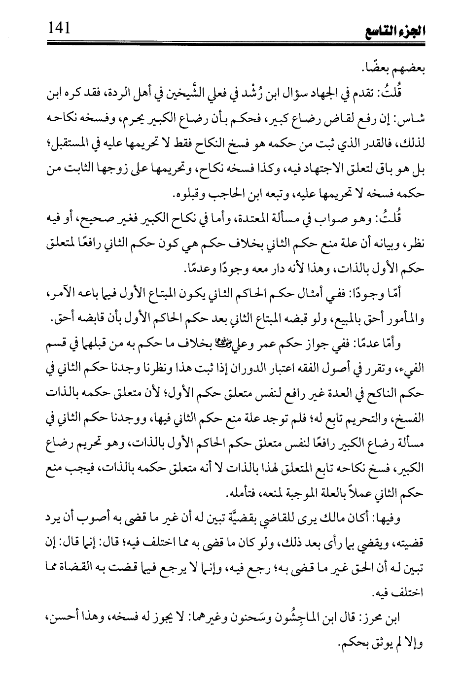 قُلتُ: تقدم في الجهاد سؤال ابن رشد في فعلي الشيخين في أهل الردة، فقد كره ابن شاس: إن رفع لقاض رضاع كبير، فحكم بأن رضاع الكبير يحرم، وفسخه نكاحه لذلك، فالقدر الذي ثبت من حكمه هو فسخ النكاح فقط لا تحريمها عليه في المستقبل؛ بل هو باق لتعلق الاجتهاد فيه، وكذا فسخه نكاح، وتحريمها على زوجها الثابت من حكمه فسخه لا تحريمها عليه، وتبعه ابن الحاجب وقبلوه.