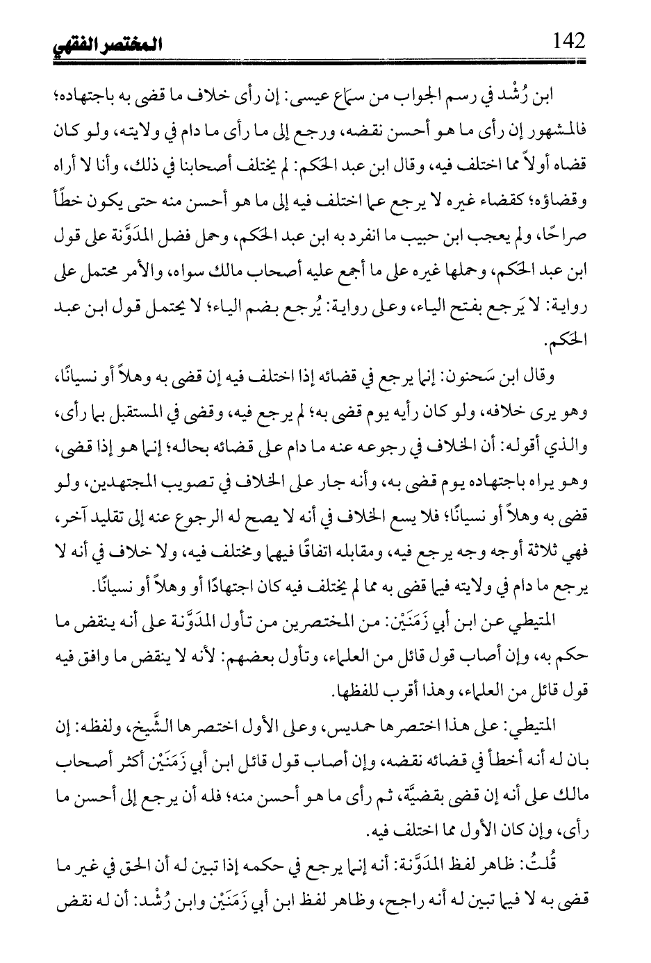 ابن رشد في رسم الجواب من سماع عيسى: إن أرى خلاف ما قضى به باجتهاده؛ فالمشهور إن أرى ما هو أحسن نقضه، ورجع إلى ما رأى ما دام في ولايته، ولو كان قضاه أولًا مما اختلف فيه، وقال ابن عبد الحكم: لم يختلف أصحابنا في ذلك، وأنا لا أراه وقضاؤه؛ كقضاء غيره لا يرجع عما اختلف فيه إلى ما هو أحسن منه حتى يكون خطًأ صراحًا، ولم يعجب ابن حبيب ما انفرد به ابن عبد الحكم، وحمل فضل المدونة على قول ابن عبد الحكم، وحملها غيره على ما أجمع عليه أصحاب مالك سواه، والأمر محتمل على رواية: لا يَرجع بفتح الياء، وعلى رواية: يُرجع بضم الياء؛ لا يحتمل قول ابن عبد الحكم.