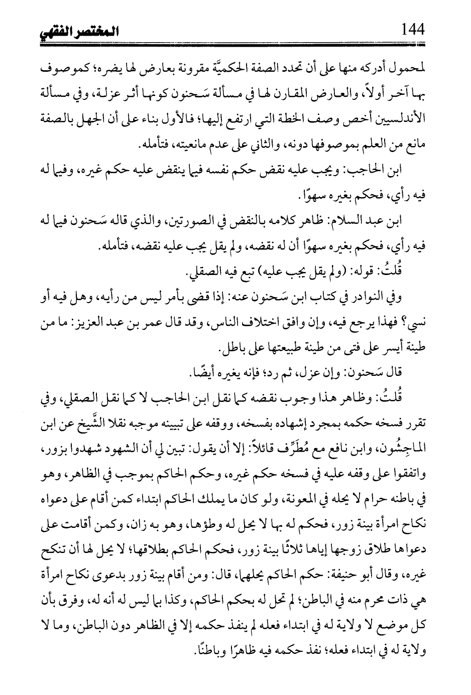 ابن عبد السلام: ظاهر كلامه بالنقض في الصورتين، والذي قاله سحنون فيما له فيه رأي، فحكم بغيره سهوًا أن له نقضه، ولم يقل يجب عليه نقضه، فتأمله.