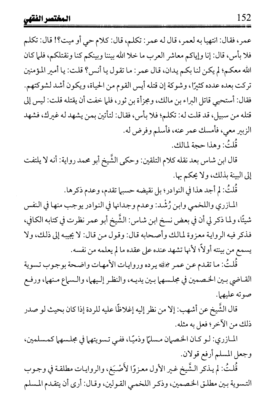 قُلتُ: ما تقدم عن عمر رضى الله عنه يرده وروايات الأمهات واضحة بوجوب تسوية القاضي بين الخصمين في مجلسهما بين يديه، والنظر إليهما، والسماع منهما، ورفع صوته عليهما.