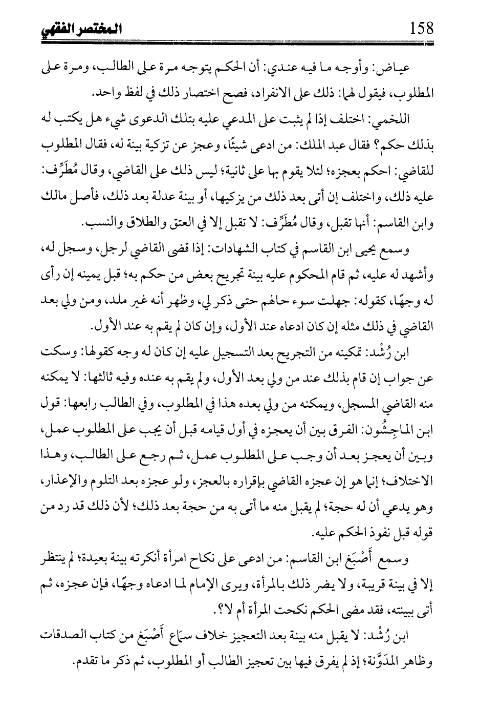 ابن رشد: لا يقبل منه بينة بعد التعجيز خلاف سماع أصبغ من كتاب الصدقات وظاهر المدونة؛ إذ لم يفرق فيها بين تعجيز الطالب أو المطلوب، ثم ذكر ما تقدم.