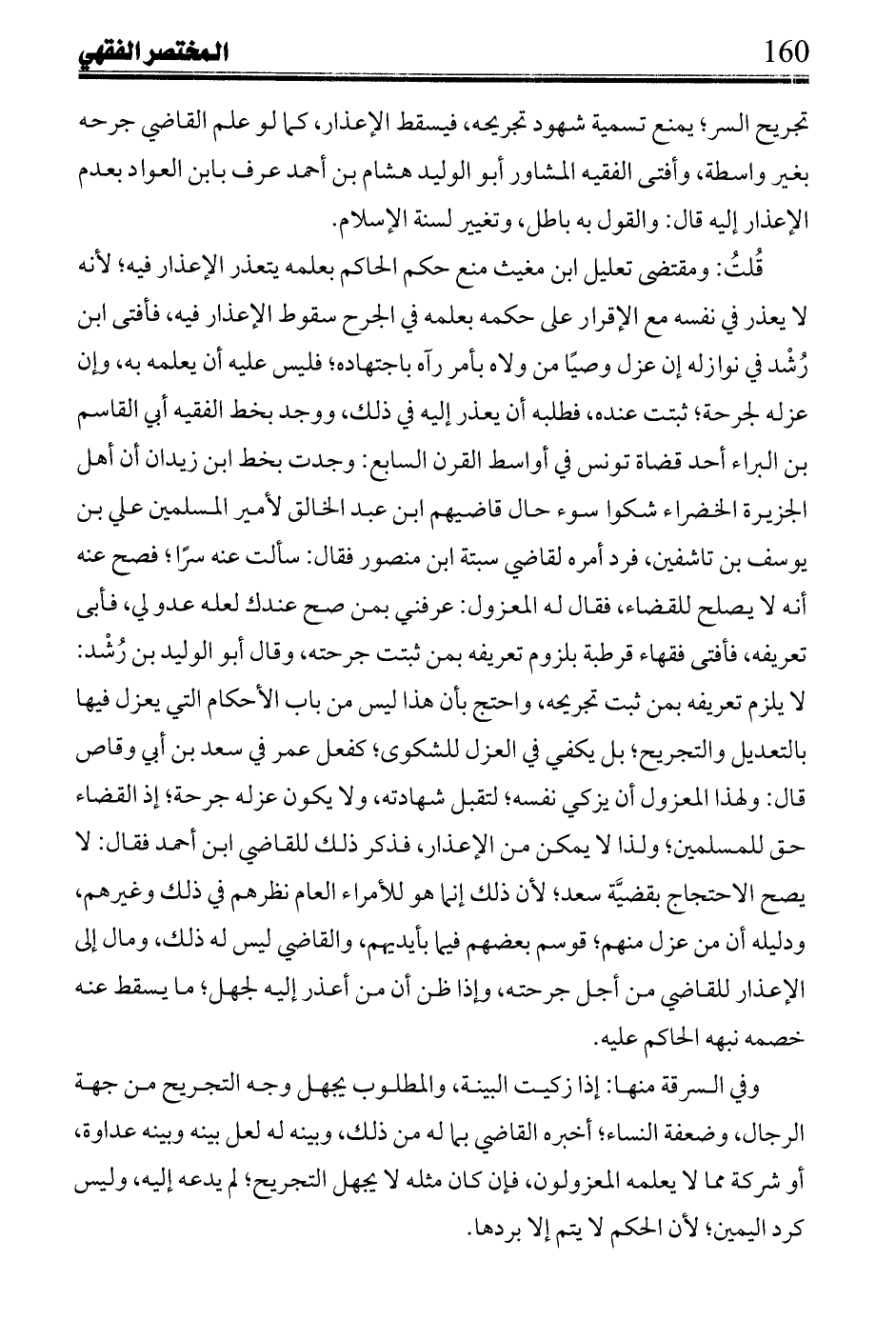 قُلتُ: ومقتضى تعليل ابن مغيث منع حكم الحاكم بعلمه يتعذر الإعذار فيه؛ لأنه لا يعذر في نفسه مع الإقرار على حكمه بعلمه في الجرح سقوط الإعذار فيه، فأفتى ابن رشد في نوازله إن عزل وصيًا من ولاه بأمر رآه باجتهاده؛ فليس عليه أن يعلمه به، وإن عزله لجرحة؛ ثبتت عنده، فطلبه أن يعذر إليه في ذلك، ووجد بخط الفقيه أبي القاسم بن البراء أحد قضاة تونس في أواسط القرن السابع: وجدت بخط ابن زيدان أن أهل الجزيرة الخضراء شكوا سوء حال قاضيهم ابن عبد الخالق لأمير المسلمين علي بن يوسف بن تاشفين، فرد أمره لقاضي سبتة ابن منصور فقال: سألت عنه سرًا؛ فصح عنه أنه لا يصلح للقضاء، فقال له المعزول: عرفني بمن صح عندك لعله عدو لي، فأبى تعريفه، فأفتى فقهاء قرطبة بلزوم تعريفه بمن ثبتت جرحته، وقال أبو الوليد بن رشد: لا يلزم تعريفه بمن ثبت تحريحه، واحتج بأن هذا ليس من باب الأحكام التي يعزل فيها بالتعديل والتجريح؛ بل يكفي في العزل للشكوى؛ كفعل عمر في سعد بن أبي وقاص قال: ولهذا المعزول أن يزكي نفسه؛ لتقبل شهادته، ولا يكون عزله جرحة؛ إذ القضاء حق للمسلمين؛ ولذا لا يمكن من الإعذار، فذكر ذلك للقاضي ابن أحمد فقال: لا يصح الاحتجاج بقضية سعد؛ لأن ذلك إنما هو للأمراء العام نظرهم في ذلك وغيرهم، ودليله أن من عزل منهم؛ قوسم بعضهم فيما بأيديهم، والقاضي ليس له ذلك، ومال إلى الإعذار للقاضي من أجل جرحته، وإذا ظن أن من أعذر إليه لجهل؛ ما يسقط عنه خصمه نبهه الحاكم عليه.