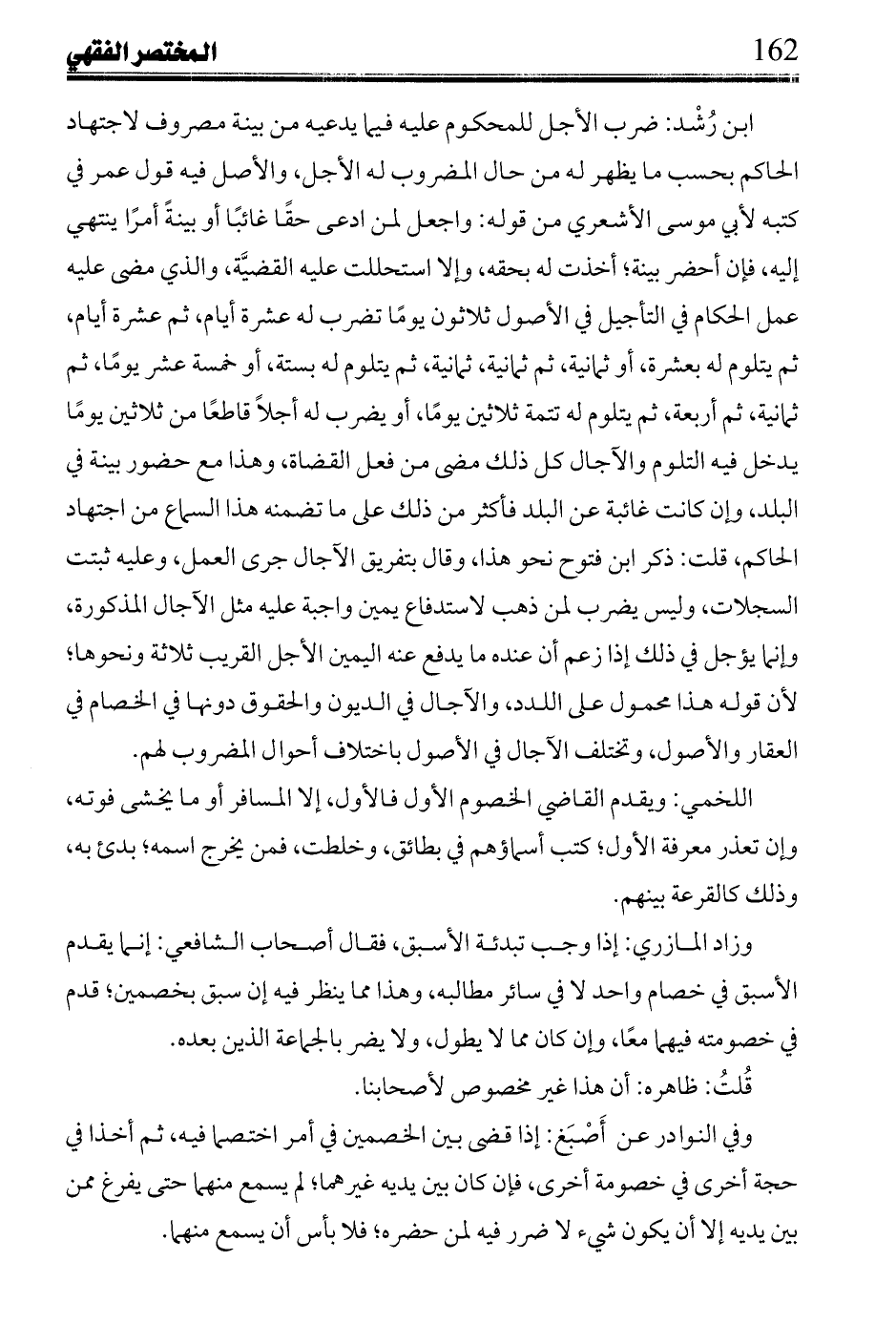 ابن رشد: ضرب الأجل للمحكوم عليه فيما يدعيه من بينة مصروف لاجتهاد الحاكم بحسب ما يظهر له من حال المضروب له الأجل، والأصل فيه قول عمر في كتبه لأبي موسى الأشعري من قوله: واجعل لمن ادعى حقًا غائبًا أو بينةً أمرًا ينتهي إليه، فإن أحضر بينة؛ أخذت له بحقه، وإلا استحللت عليه القضية، والذي مضى عليه عمل الحكام في التأجيل في الأصول ثلاثون يومًا تضرب له عشرة أيام، ثم عشرة أيام، ثم يتلوم له بعشرة، أو ثمانية، ثم ثمانية، ثمانية، ثم يتلوم له بستة، أو خمسة عشر يومًا، ثم ثمانية، ثم أربعة، ثم يتلوم له تتمة ثلاثين يومًا، أو يضرب له أجلًا قاطعًا من ثلاثين يومًا يدخل فيه التلوم والآجال كل ذلك مضى من فعل القضاة، وهذا مع حضور بينة في البلد، وإن كانت غائبة عن البلد فأكثر من ذلك على ما تضمنه هذ االسماع من اجتهاد الحاكم، قلت: ذكر ابن فتوح نحو هذا، وقال بتفريق الآجال جرى العمل، وعليه ثبتت السجلات، وليس يضرب لمن ذهب لاستدفاع يمين واجبة عليه مثل الآجال المذكورة، وإنما يؤجل في ذلك إذا زعم أن عنده ما يدفع عنه اليمين الأجل القريب ثلاثة ونحوها؛ لأن قوله هذا محمول على اللدد، والآجال في الديون والحقوق دونها في الخصام في العقار والأصول، وتختلف الآجال في الأصول باختلاف أحوال المضروب لهم.
