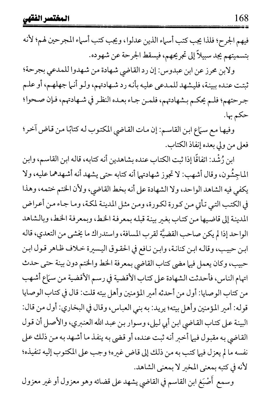 ابن رشد: اتفاقاً إذا ثبت الكتاب عنده بشاهدين أنه كتابه، قال ابن القاسم، وابن الماجشون، وقال أشهب: لا تجوز شهادتهما أنه كتابه حتى يشهد أنه أشهدهما عليه، ولا يكفي فيه الشاهد الواحد، ولا الشهادة على أنه بخط القاضي، ولأن الختم ختمه، وهذا في الكتب التي تأتي من كورة لكوره، ومن مثل المدينة لمكة، وما جاء من أعراض المدينة إلى قاضيها من كتاب بغير بينة قبلة بمعرفة الخط، وبمعرفة الخط، وبالشاهد الواحد إذا لم يكن صاحب القضية لقرب المسافة، واستدراك ما يخشى من التعدي، قاله ابن جنيب، وقاله ابن كنانة، وابن نافع في الحقوق اليسيرة خلاف ظاهر قول ابن حبيب، وكان يعمل فيما مضى كتاب القاضي بمعرفة الخط والختم دون بينة حتى حدث اتهام الناس، فأحدثت الشهادة على كتاب الأقضية في رسم الأقضية من سماع أشهب من كتاب الوصايا: أول من أحدثه أمير المؤمنين وأهل بيته قلت: قال في كتاب لوصايا قوله: أمير المؤمنين وأهل بيته؛ يريد: به بني العباس، وقال في البخاري: أول من قال البينة على كتاب القاضي ابن أبي ليلى، وسوار بن عبد الله العنبري، والأصل أن قول القاضي به مقبول فيما أخبر أنه ثبت عنده، أو قضى به ينفذ ما أشهد به من ذلك على نفسه ما لم يعزل فيما كتب به من ذلك إلى قاض غيره؛ وجب على المكتب إليه تنفيذه؛ لأنه في كتبه بمعني المخبر لا بمعني الشاهد.