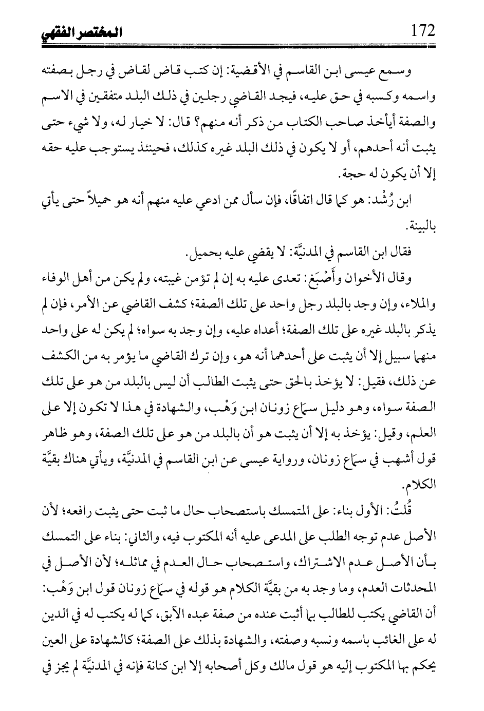 قلت: الأول بناء: على المتمسك باستصحاب حال ما ثبت حتى يثبت رافعه؛ لأن الأصل عدم توجه الطلب على المدعي عيلة أنه المكتوب فيه، والثاني: بناء على المتمسك بأن الأصل عدم الاشتراك، واستصحاب حال العدم في مماثله؛ لأن الأصل في المحدثات العدم، وما وجد به من بقية الكلام هو قوله في سماع زونان قول ابن وهب: أن القاضي يكتب للطالب بما أثبت عنده من صفة عبده الآبق، كما له يكتب له في الدين له على الغائب باسمه ونسبه وصفته، والشهادة بذلك على الصفة؛ كالشهادة على العين يحكم بها المكتوب إليه هو قول مالك وكل أصحابه إلا ابن كنانة فإنه في المدينة لم يجز في
