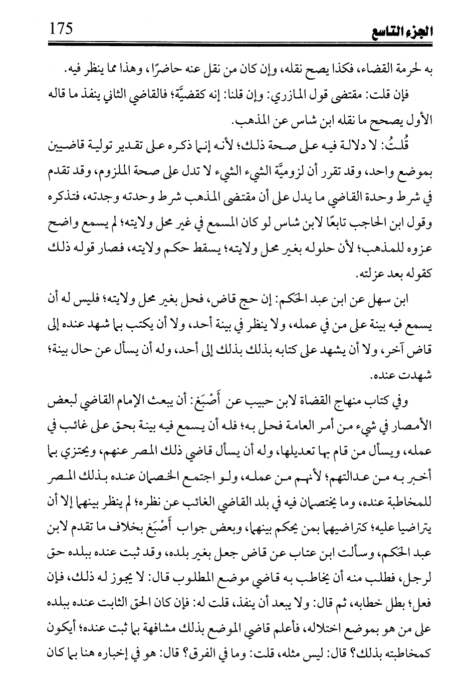 قلت: لا دلالة فيه على صحة ذلك؛ لأنه إنما ذكره على تقدير تولية قاضيين بموضع واحد، وقد تقرر أن لزومية الشيء الشيء لا تدل على صحة الملزوم، وقد تقدم في شرط وحدة القاضي ما يدل على أن مقتضى المذهب شرط وحدته وجدته، فتذكره وقول ابن الحاجب تابعا لابن شاس لو كان المسمع في غير محل ولايته؛ لم يسمع واضح عزوه للمذهب؛ لأن حلوله بغير محل ولايته؛ يسقط حكم ولايته، فصار قوله ذلك كقوله بعد عزلته.