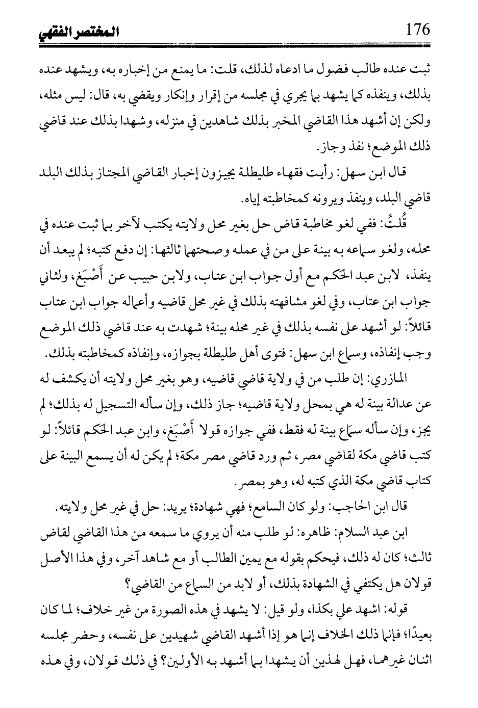 ابن عبد السلام: ظاهره: لو طلب منه أن يروي ما سمعه من هذا القاضي لقاض ثالث؛ كان له ذلك، فيحكم بقوله مع يمين الطالب أو مع شاهد آخر، وفي هذا الأصل قولان هل يكتفي في الشهادة بذلك، أو لابد من السماع من القاضي؟