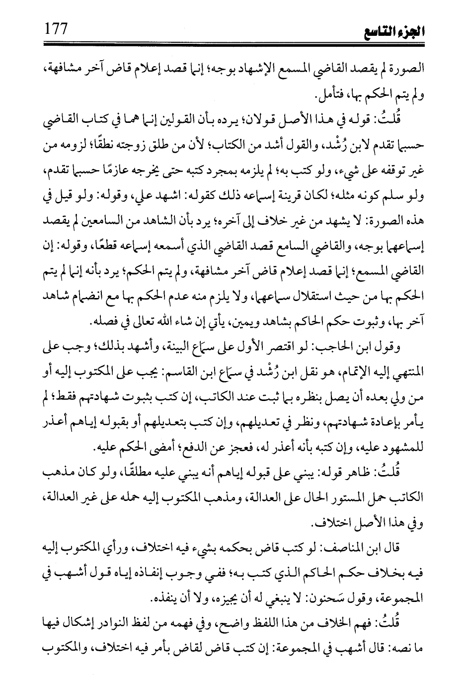 قلت: قوله في هذا الأصل قولان؛ يرده بأن القولين إنما هما في كتاب القاضي حسبما تقدم لابن رشد، والقول أشد من الكتاب؛ لأن من طلق زوجته نطقا؛ لزومه من غير توقفه على شيء، ولو كتب به؛ لم يلزمه بمجرد كتبه حتى يخرجه عازما حسبما تقدم، ولو سلم كونه مثله؛ لا يشهد من غير خلاف إلى آخره؛ يرد بأن الشاهد من السامعين لم يقصد إسماعهما بوجه، والقاضي السامع قصد القاضي الذي أسمعه إسماعا قطعا، وقوله: إن القاضي المسمع؛ إنما قصد إعلام قاض آخر مشافهة، ولم يتم الحكم؛ يرد بأنه إنما لم يتم الحكم بها من حيث استقلال سماعهما، ولا يلزم منه عدم الحكم بها مع انضمام شاهد آخر بها، وثبوت حكم الحاكم بشاهد ويمين، يأتي إن شاء الله تعالى في فصله.