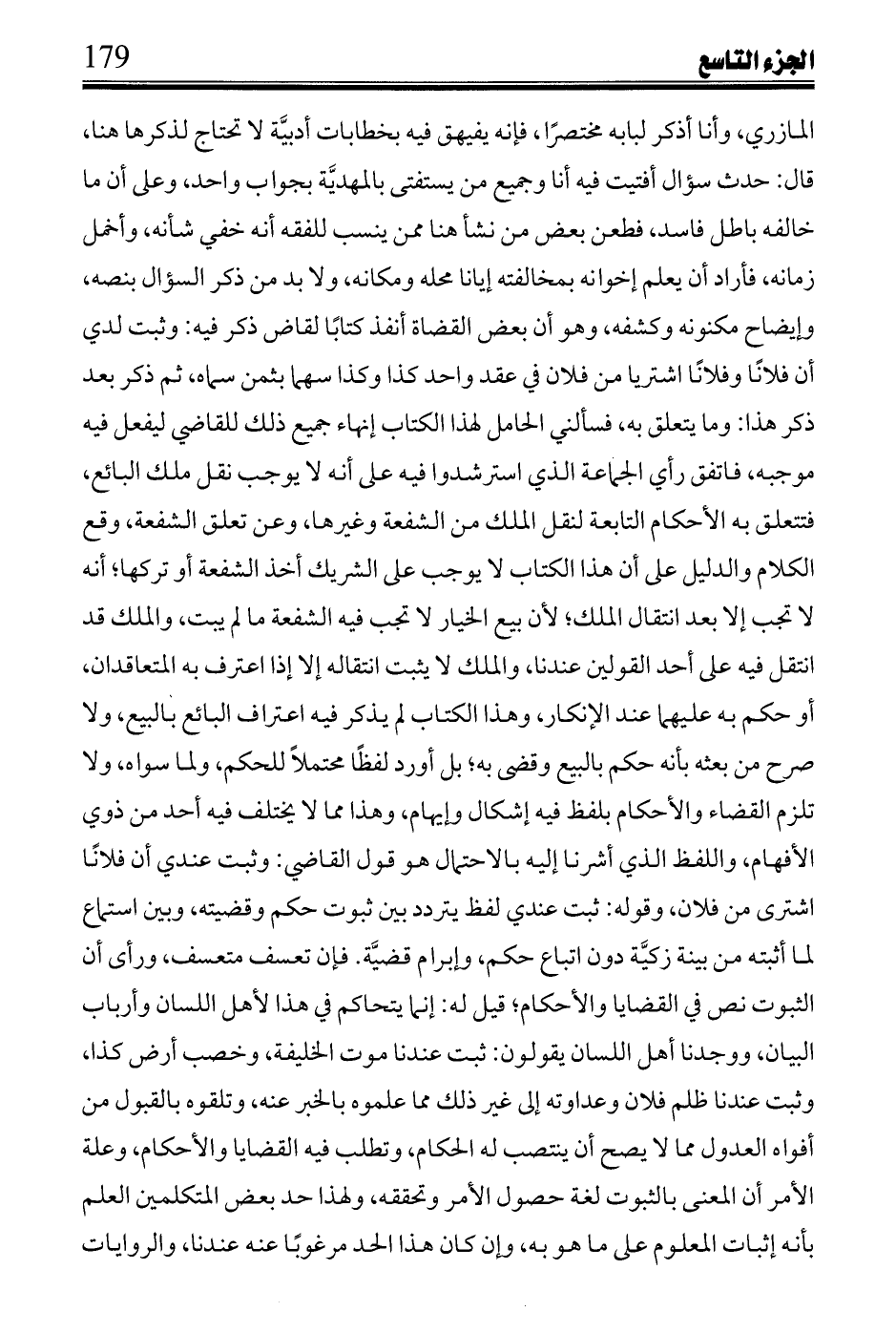 المازري، وأنا أذكر لبابه مختصراً، فإنه يتفيهق فيه بخطابات أدبية لا تحتاج لذكرها هنا، قال: حدث سؤال أفتيت فيه أنا وجميع من يستفتى بالمهدية بجواب واحد، وعلى أن ما خالفه باطل فاسد، فطعن بعض من نشأ هنا ممن ينسب للفقه أنه خفي شأنه، وأخمل زمانه، فأراد أن يعلم إخوانه بمخالفته إيانا محله ومكانه، ولا بد من ذكر السؤال بنصه، وإيضاح مكنونة وكشفه، وهو أن بعض القضاة أنفذ كتابا لقاض ذكر فيه: وثبت لدي أن فلاناً وفلاناً اشتريا من فلان في عقد واحد كذا وكذا سهما بثمن سماه، ثم ذكر بعد ذكر هذا: وما يتعلق به، فسألني الحامل لهذا الكتاب إنهاء جميع ذلك للقاضي ليفعل فيه موجبه، فاتفق رأي الجماعة الذي استرشدوا فيه على أنه لا يوجب نقل ملك البائع، فتتعلق به الأحكام التابعة لنقل الملك من الشفعة وغيرها، وعن تعلق الشفعة، وقع الكلام والدليل على أن هذا الكتاب لا يوجب على الشريك أخذ الشفعة أو تركها؛ أنه لا تجب إلا بعد انتقال الملك؛ لأن بيع الخيار لا حب فيه الشفعة ما لم يبيت، والملك قد انتقل فيه على أحد القولين عندنا، والملك لا يثبت انتقاله إلا إذا اعترف به المتعاقدان، أو حكم به عليهما عند الإنكار، وهذا الكتاب لم يذكر فيه اعتراف البائع بالبيع، ولا صرح من بعثه بأنه حكم بالبيع وقضى به؛ بل أورد لفظاُ محتملاً للحكم، ولما سواه، ولا تلزم القضاء والأحكام بلفظ فيه إشكال وإيهام، وهذا مما لا يختلف فيه أحد من ذوي الأفهام، واللفظ الذي أشرنا إليه بالاحتمال هو قول القاضي: وثبت عندي أن فلانا اشتري من فلان، وقوله: ثبت عندي لفظ يتردد بين ثبوت حكم وقضيته، وبين استماع لما أثبته من بينة زكية دون اتباع حكم، وإبرام قضية, فإن تعسف متعسف، ورأى أن الثبوت نص في القضايا والأحكام؛ قيل له: إنما يتحاكم في هذا لأهل اللسان وأرباب البيان، ووجدنا أهل اللسان يقولون: ثبت عندنا موت الخليفة، وخصب أرض كذا، وثبت عندنا ظلم فلان وعداوته إلى غير ذلك مما علموه بالخبر عنه، وتلقوه بالقبول من أفواه العدول مما لا يصح أن ينتصب له الحكام، وتطلب فيه القضايا والأحكام، وعلة الأمر أن المعني بالثبوت لغة حصول الأمر وتحققه، ولهذا حد بعض المتكلمين العلم بأنه إثبات المعلوم على ما هو به، وإن كان هذا الحد مرغوباً عنه عندنا، والروايات