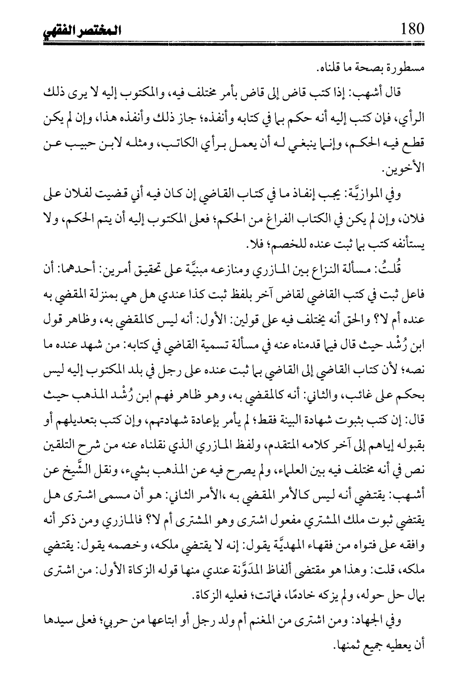 قلت: مسألة النزاع بين المازري ومنازعه مبنية على تحقيق أمرين: أحدهما: أن فاعل ثبت في كتب القاضي لقاض آخر بلفظ ثبت كذا عندي هل هي بمنزلة المقضي به عنده أم لا؟ والحق أنه يختلف فيه على قولين: الأول: أنه ليس كالمقتضي به, وظاهر قول ابن رشد حيث قال فيما قدمناه عنه في مسألة تسمية القاضي في كتابه: من شهد عنده ما نصه؛ لأن كتاب القاضي إلى القاضي بما ثبت عنده على رجل في بلد المكتوب إليه ليس بحكم على غائب, والثاني: أنه كالمقتضي به, وهو ظاهر فهم ابن رشد المذهب حيث قال: إن كتب بثبوت شهادة البينة فقط؛ لم يأمر بإعادة شهادتهم, وإن كتب بتعديلهم أو بقبوله إياهم إلى آخر كلامه المتقدم, ولفظ المازري الذي نقلناه عنه من شرح التلقين نص في أنه مختلف فيه بين العلماء, ولم يصرح فيه عن المذهب بشيء, ونقل الشيخ عن أشهب: يقتضي أنه ليس كالأمر المقتضب به, الأمر الثاني: هو أن مسمى اشترى هل يقتضي ثبوت ملك المشتري مفعول اشترى وهو المشترى أم لا؟ فالمزري ومن ذكر أنه وافقه على فتواه من فقهاء المهدية يقول: إنه لا يقتضي ملكه, وخصمه يقول: يقتضي ملكه, قلت: وهذا هو مقتضى ألفاظ المدونة عندي منها قوله الزكاة الأول: من اشترى بمال حل حوله, ولم يزكه خادماً, فماتت؛ فعليه الزكاة.