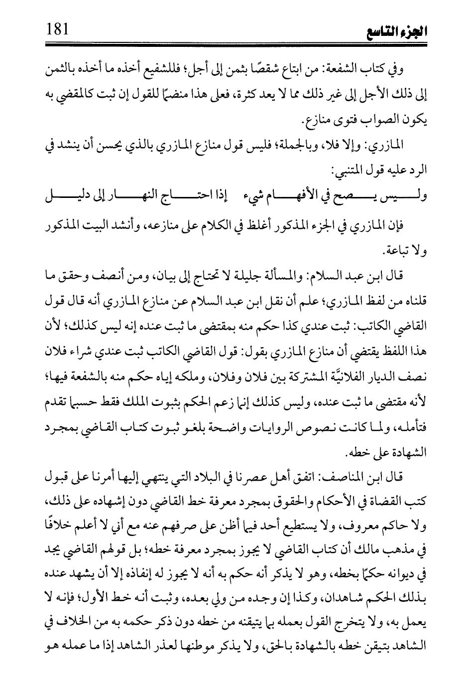 قال اين عبد السلام: والمسألة جليلة لا تحتاج إلى بيان, ومن أنصف وحقق ما قلناه من لفظ المازري؛ علم أن نقل ابن عبد السلام عن منازع المازري أنه قال قول القاضي الكاتب: ثبت عندي كذا حكم منه بمقتضى ما ثبت عنده أنه ليس كذلك؛ لأن هذا اللفظ يقتضي أن منازع المازري بقول: قول القاضي الكاتب ثبت عندي شراء فلان نصف الديار الفلانية المشتركة بين فلان وفلان, وملكه إياه حكم منه بالشفعة فيها؛ لأنه مقتضى ما ثبت عنده, وليس كذلك إنما زعم الحكم بثبوت الملك فقط حسبما تقدم فتأمله, ولما كانت نصوص الروايات واضحة بلغو ثبوت كتاب القاضي بمجرد الشهادة على خطه.