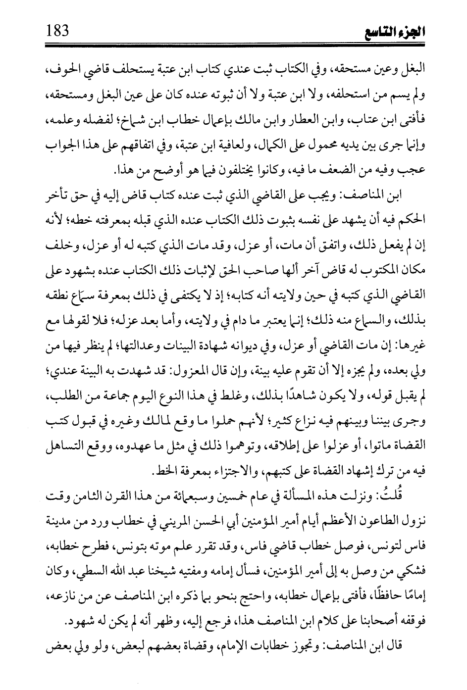 قلت: ونزلت هذه المسألة في عام خمسين وسبعمائة من هذا القرن الثامن وقت نزول الطاعون الأعظم أيام أمير المؤمنين أبي الحسن المريني في خطاب ورد من مدينة فاس لتونس, فوصل خطاب قاضي فاس, وقد تقرر علم موته بتونس, فطرح خطابه, فشكي من وصل به إلى أمير المؤمنين, فسأل إمامه ومفتيه شيخنا عبد الله السطي, وكان إماماً حافظاً, فأفتى بإعمال خطابه, واحتج بنحو بما ذكره ابن المناصف عن من نازعه, فوقفه أصحابنا على كلام ابن المناصف هذا, فرجع إليه, وظهر أنه لم يكن له شهود.