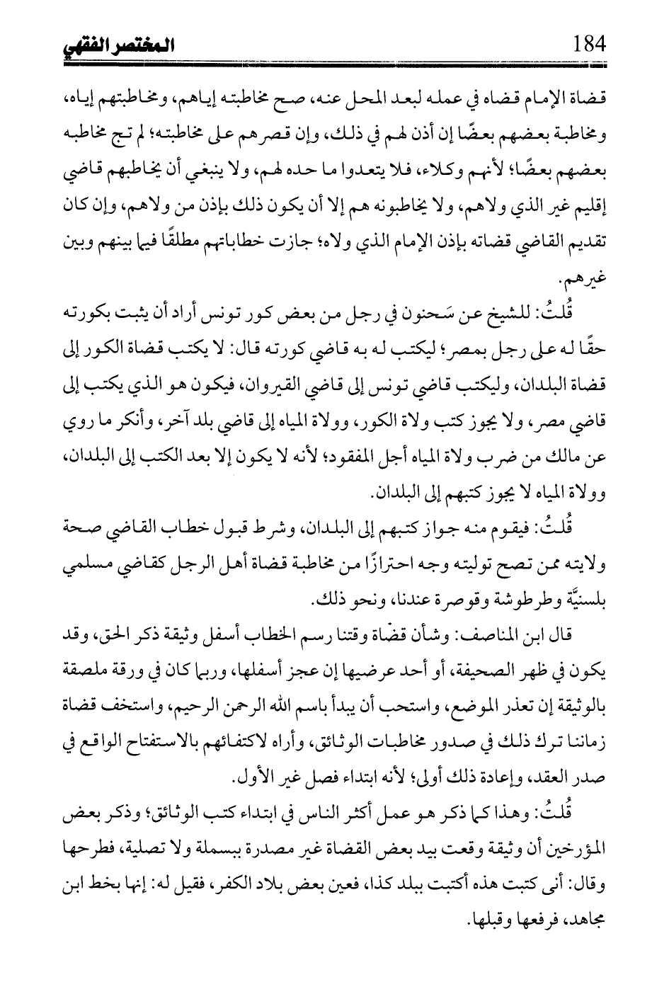 قلت: للشيخ عن سحنون في رجل من بعد كور تونس أراد أن يثبت بكورته حقاً له على رجل بمصر؛ ليكتب له به قاضي كورته قال: لا يكتب قضاة الكور إلى قضاة البلدان, وليكتب قاضي تونس إلى قاضي القيروان, فيكون هو الذي يكتب إلى قاضي مصر, ولا يجوز كتب ولاة الكور, وولاة المياه إلى قاضي بلد آخر, وأنكر ما روي عن مالك من ضرب ولاة المياه أجل المفقود؛ لأنه لا يكون إلا بعد الكتب إلى البلدان, وولاة المياه لا يجوز كتبهم إلى البلدان.
