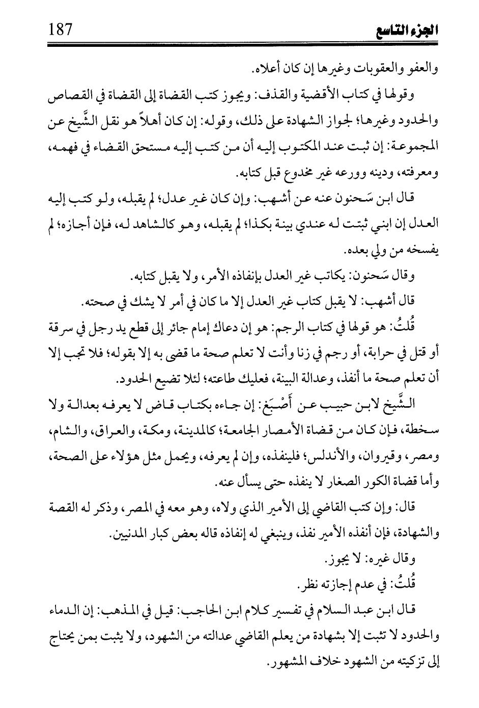 وقولها في كتاب الأقضية والقذف: يجوز كتب القضاة إلى القضاة في القصاص والحدود وغيرها؛ لجواز الشهادة على ذلك, وقوله: إن كان أهلاً هو نقل الشيخ عن المجموعة: إن ثبت عند المكتوب إليه أن من كتب إليه مستحق القضاء في فهمه, ومعرفته, ودينه وورعه غير مخدوع قبل كتابه.