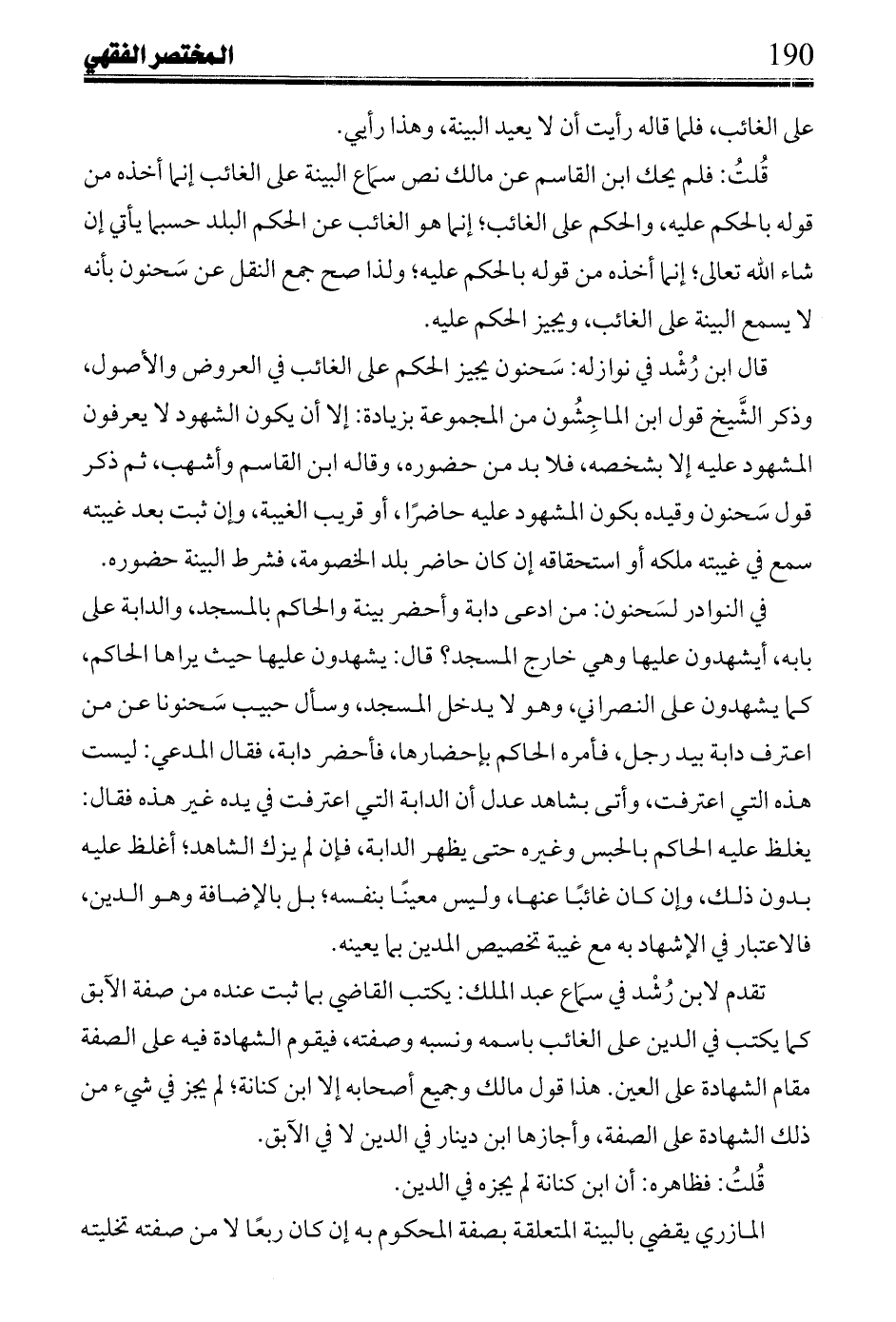 قلت: فلم يحك ابن القاسم عن مالك نص سماع البينة على الغائب إنما أخذه من قوله بالحكم عليه, والحكم على الغائب؛ إنما هو الغائب عن الحكم البلد حسبما يأتي إن شاء الله تعالى؛ إنما أخذه من قوله بالحكم عليه؛ ولذا صح جمع النقل عن سحنون بأنه لا يسمع البينة على الغائب, ويجيز الحكم عليه.