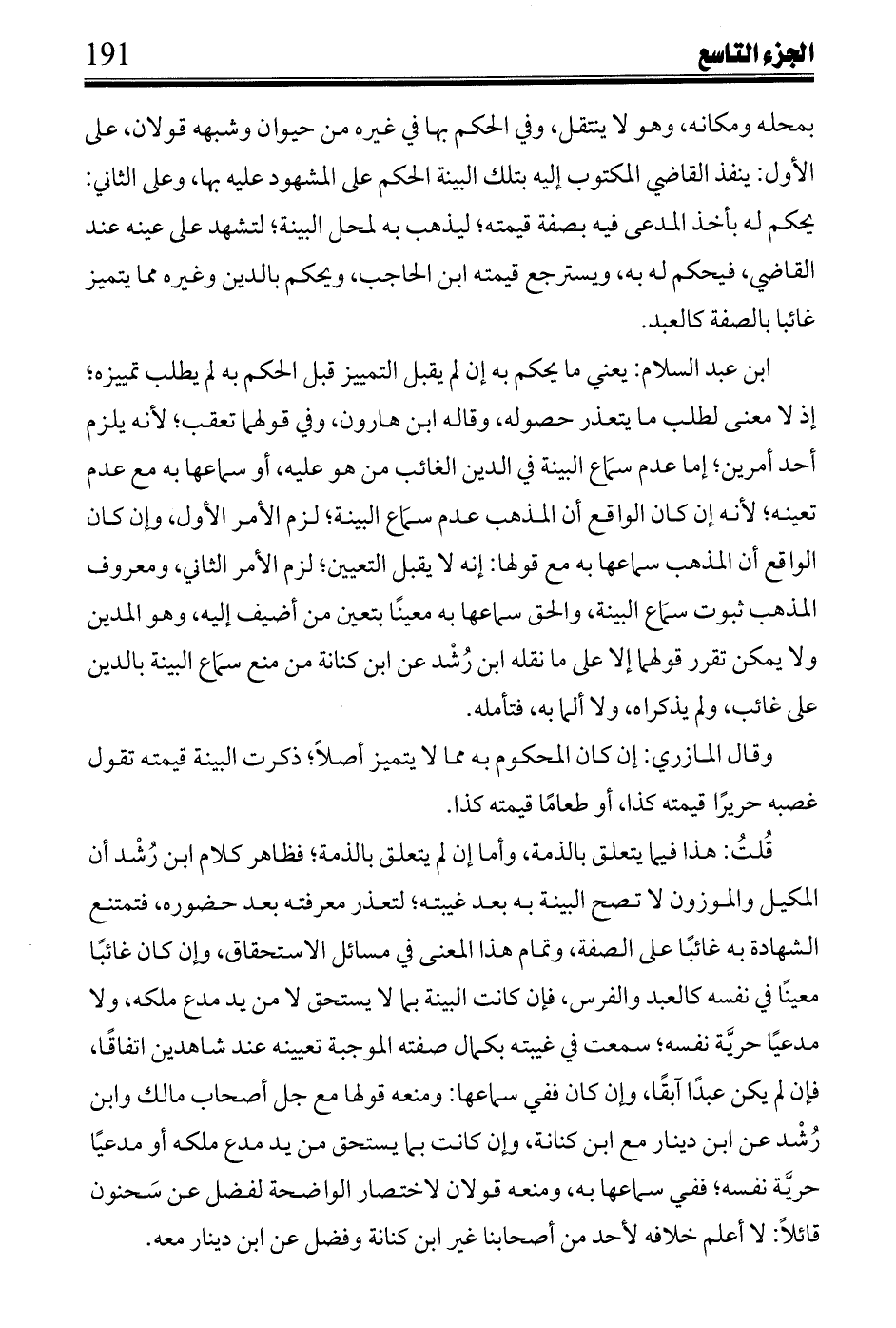ابن عبد السلام: يعني ما يحكم به إن لم يقبل التمييز قبل الحكم به لم يطلب تمييزه؛ إذ لا معنى لطلب ما يتعذر حصوله، وقال ابن هارون، وفي قولهما تعقب؛ لأنه يلزم أحد أمرين؛ أما عدم سماع البينة في الدين الغائب من هو عليه، أو سماعها به مع عدم تعينه؛ لأنه إن كان الواقع أن المذهب عدم سماع البينة؛ لزم الأمر الأول، وإن كان الواقع أن المذهب سماعها به مع قولها: إنه لا يقبل التعيين؛ لزم الأمر الثاني، ومعروف المذهب ثبوت سماع البينة، والحق سماعها به معيناً بتعين من أضيف إليه، وهو المدين ولا يمكن تقرر قولهما إلا على ما نقله ابن رشد عن ابن كنانة من منع سماع البينة بالدين على غائب، ولم يذكراه، ولا ألما به، فتأمله.