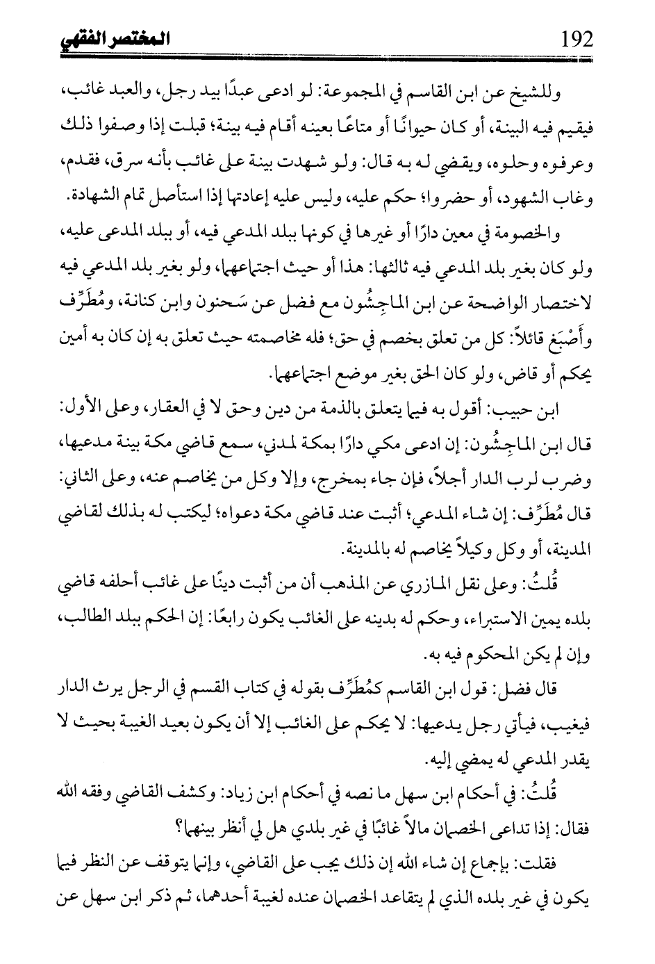 وأصبغ قائلاً: كل من تعلق بخصم في حق؛ فله مخاصمته حيث تعلق به إن كان به أمين يحكم أو قاض، ولو كان الحق بغير موضع اجتماعهما.