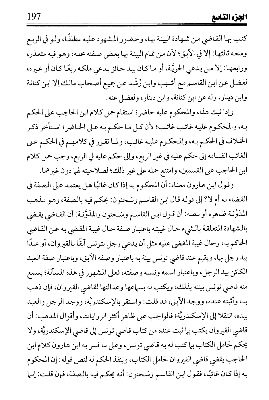 وقول ابن هارون معناه: أن المحكوم به إذا كان غائبًا هل يعتمد على الصفة في القضاء به أم لا؟ إلى قوله قال ابن القاسم وسحنون: يحكم فيه بالصفة، وهو مذهب المدونة ظاهره أو نصه: أن قول ابن القاسم وسحنون والمدونة: أن القاضي يقضي بالشهادة المتعلقة بالشيء حال غيبته باعتبار صفة حال غيبة المقضي به عن القاضي الحاكم به، وحال غيبة المقضي عليه مثل أن يدعى رجل بتونس آبقًا بالقيروان، أو عبدًا بيد رجل بها، ويقيم عند قاضي تونس بينة به باعتبار وصفه الآبق، وباعتبار صفة العبد الكائن بيد الرجل، وباعتبار اسمه ونسبه وصفته، فعلى المشهور في هذه المسألة؛ يسمع منه قاضي تونس بينته بذلك، ويكتب له بسماعها وعدالتها لقاضي القيروان، فإن ذهب به، وأثبته عنده، ووجد الآبق، قد قلت: واستقر بالإسكندرية، ووجد الرجل والعبد بيده، انتقلا إلى الإسكندرية؛ فالواجب على ظاهر أكثر الروايات، وأقوال المذهب: أن قاضي القيروان يكتب بما ثبت عنده من كتاب قاضي تونس إلى قاضي الإسكندرية، ولا يحكم لحامل الكتاب بما كتب له به قاضي تونس، وعلى ما فسر به ابن هارون كلام ابن الحاجب يقضي قاضي القيروان لحامل الكتاب، وينفذ الحكم له النص قولة: إن المحكوم به إذا كان غائبًا، فقول ابن القاسم وسحنون: أنه يحكم فيه بالصفة، فإن قلت: إنما