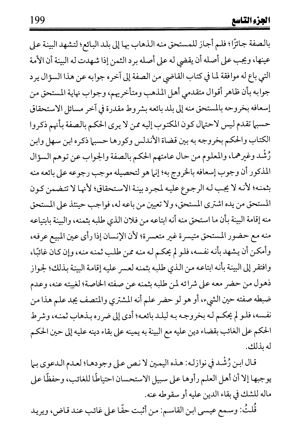 بالصفة جائزًا؛ فلم أجاز للمستحق منه الذهاب بها إلى بلد البائع؛ لتشهد البينة على عينها، ويجب على أصله أن يقضي له على أصله برد الثمن إذا شهدت له البينة أن الأمة التي باع له موافقة لما في كتاب القاضي من الصفة إلى آخره جوابه عن هذا السؤال يرد جوابه بان ظاهر أقوال متقدمي أهل المذهب ومتأخريهم، وجواب نهاية المستحق من إسعافه بخروجه بالمستحق منه إلى بلد بائعه بشروط مقدرة في آخر مسائل الاستحقاق حسبما تقدم ليس لاحتمال كون المكتوب إليه ممن لا يرى الحكم بالصفة بأنهم ذكروا الكتاب والحكم بخروجه به بين قضاة الأندلس وكورها حسبما ذكره ابن سهل وابن رشد وغيرهما، والمعلوم من حال عامتهم الحكم بالصفة والجواب عن توهم السؤال المذكور أن وجوب إسعافه بالخروج به؛ إنما هو لتحصيله موجب رجوعه على بائعه منه بثمنه؛ لأنه يجب له الرجوع عليه لمجرد بينة الاستحقاق؛ لأنها لا تتضمن كون المستحق من يده اشترى المستحق، ولا تعيين من باعه له، فواجب حينئذ على المستحق منه إقامة البينة بأن ما استحق منه أنه ابتاعه من فلان الذي طلبه بثمنه، والبينة بابتياعه منه مع حضور المستحق متيسرة غير متعسرة؛ لأن الإنسان إذا رأى عين المبيع عرفه، وأمكن أن يشهد بأنه نفسه، فلو لم يحكم له منه ممن طلب ثمنه منه، وإن كان غائبًا وافتقر إلى البينة بأنه ابتاعه من الذي طلبه بثمنه لعسر عليه إقامة البينة بذلك؛ لجواز ذهول من حضر معه على شرائه لمن طلبه بثمنه عن صفته الخاصة؛ لغيبته عنه، وعدم ضبطه صفته حين الشيء، أو هو لو حضر علم أنه المشترى والمتصف يجد علم هذا من نفسه، فلو لم يحكم له بخروجه به لبلد بائعه؛ أدى إلى ضرره بذهاب ثمنه، وشرط الحكم على الغائب بقضاء دين عليه مع البينة به يمينه على بقاء دينه عليه إلى حين الحكم له ذلك.