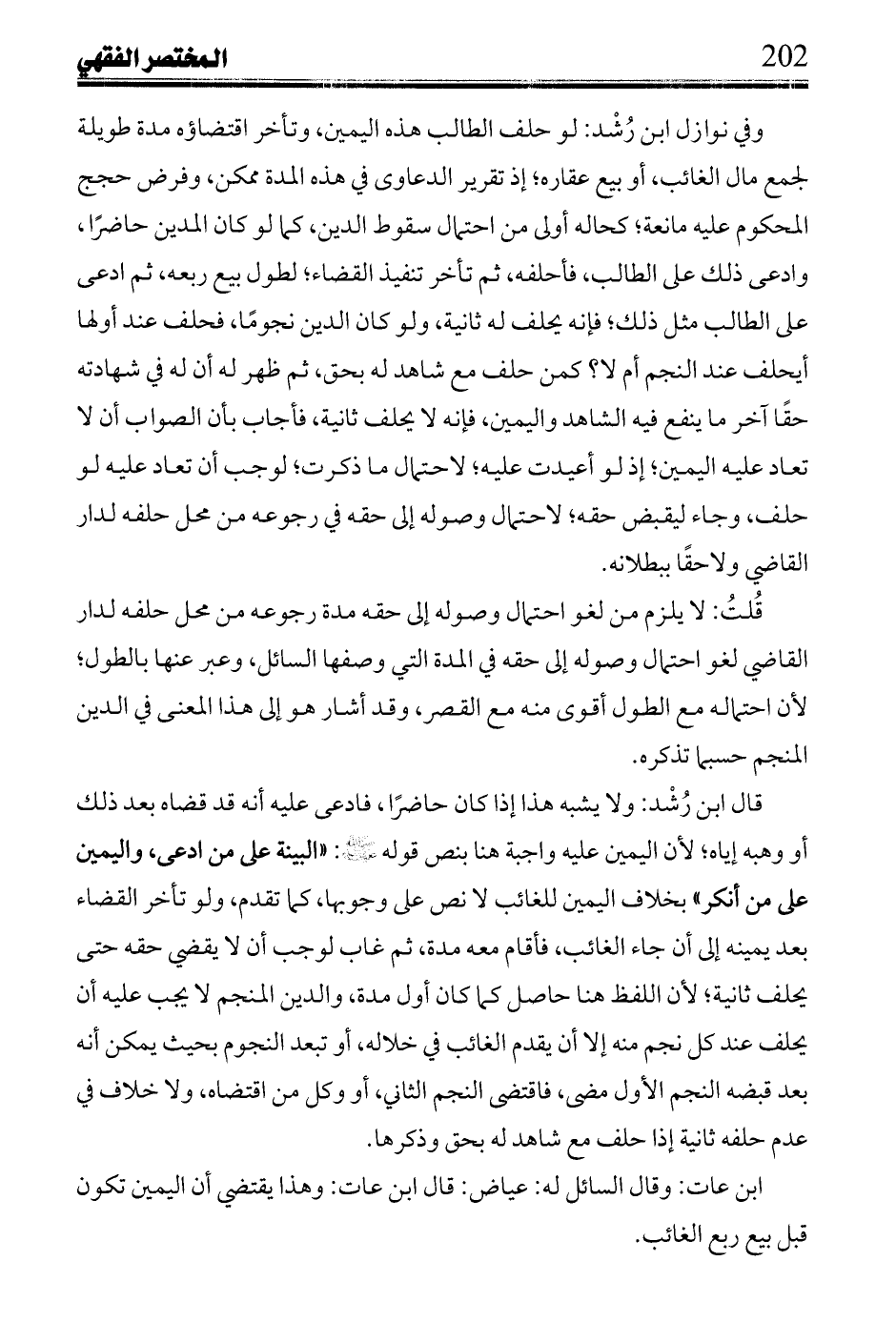 وفي "نوازل ابن رشد": لو حلف الطالب هذه اليمين، وتأخر اقتضاؤه مدة طويلة لجمع مال الغائب، أو بيع عقاره؛ إذ تقرير الدعاوى في هذه المدة ممكن، وفرض حجج المحكوم عليه مانعة؛ كحاله أولى من احتمال سقوط الدين، كما لو كان المدين حاضرًا، وادعى ذلك على الطالب، فأحلفه، ثم تأخر تنفيذ القضاء؛ لطول بيع ربعه، ثم ادعى على الطالب مثل ذلك؛ فإنه يحلف له ثانية، ولو كان الدين نجومًا، فحلف عند أولها أيحلف عند النجم أم لا؟ كمن حلف مع شاهد له بحق، ثم ظهر له أن له في شهادته حقًا آخر ما ينفع فيه الشاهد واليمين، فإنه لا يحلف ثانية، فأجاب بأن الصواب أن لا تعاد عليه اليمين؛ إذ لو أعيدت عليه؛ لاحتمال ما ذكرت؛ لوجب أن تعاد عليه لو حلف، وجاء ليقبض حقه؛ لاحتمال وصوله إلى حقه في رجوعه من محل حلفه لدار القاضي ولا حقًا ببطلانه.
