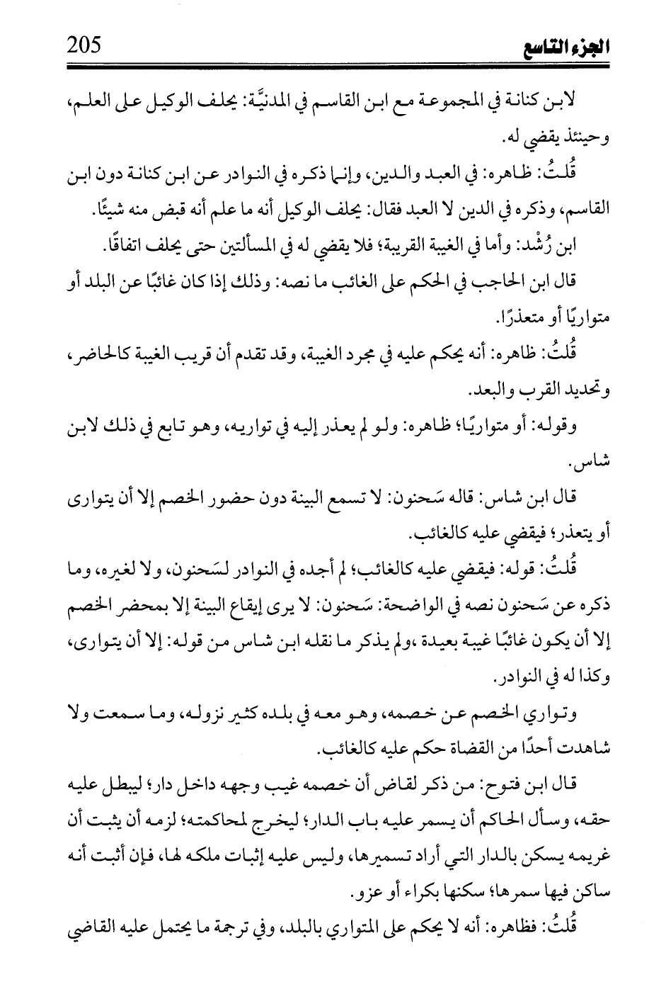 قلت: قوله: فيقضي عليه كالغائب؛ لم أجده في النوادر لسحنون، ولا لغيره، وما ذكره عن سحنون نصه في الواضحة: سحنون: لا يرى إيقاع البينة إلا بمحضر الخصم إلا أن يكون غائبًا غيبة بعيدة، ولم يذكر ما نقله ابن شاس من قوله: إى أن يتوارى، وكذا له في النوادر.