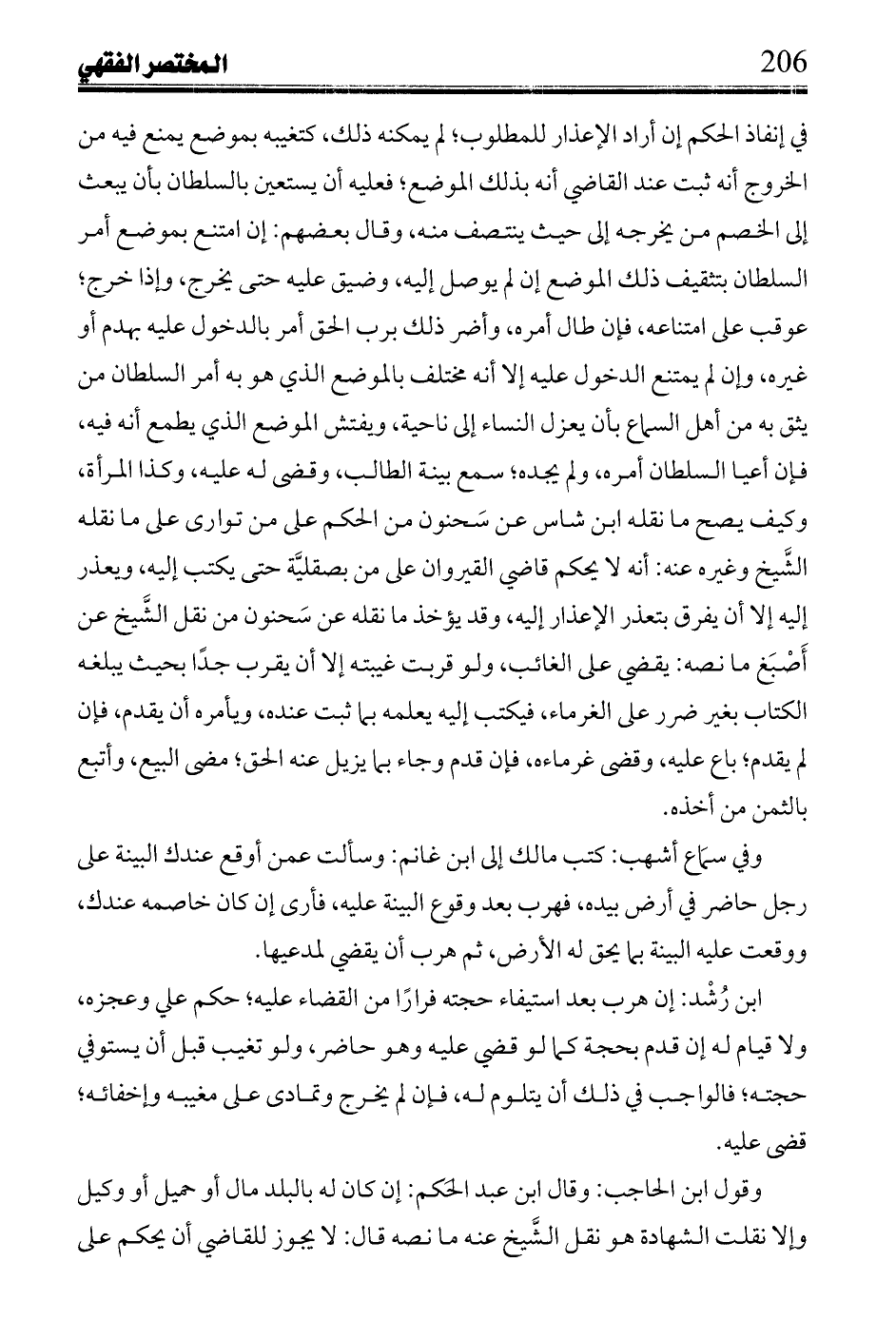 في إنفاذ الحكم إن أراد الأعذار للمطلوب؛ لم يمكنه ذلك، كتغيبه بموضع يمنع فيه من الخروج أنه ثبت عند القاضي أنه بذلك الموضع؛ فعليه أن يستعين بالسلطان بان يبعث إلى الخصم من يخرجه إلى حيث ينتصف منه، وقال بعضهم: إن امتنع بموضع أمر السلطان بتثقيف ذلك الموضع إن لم يوصل إليه، وضيق عليه حتى يخرج، وإذا خرج؛ عوقب على امتناعه، فإن طال أمره، وأضر ذلك برب الحق أمر بالدخول عليه بهدم أو غيره، وإن بلم يمتنع الدخول عليه إلا أنه مختلف بالموضع الذي هو به أمر السلطان من يثق به من أهل السماع بان يعزل النساء إلى ناحية، ويفتش الموضع الذي يطمع أنه فيه، فإن أعيا السلطان أمره، ولم يجده؛ سمع بينة الطالب، وقضى له عليه، وكذا المرأة، وكيف يصح ما نقله ابن شاس عن سحنون من الحكم على من توارى على نقله الشيخ وغيره عنه: أنه لا يحكم قاضي القيروان على من بصقلية حتى يكتب إليه، ويعذر غليه إلا أن يفرق بتعذر الأعذار إليه، وقد يؤخذ ما نقله عن سحنون من نقل الشيخ عن أصبغ ما نصه: يقضي على الغائب، ولو قربت غيبته إلا أن يقرب جدًا بحيث يبلغه الكتاب بغير ضرر على الغرماء، فيكتب إليه يعلمه بما ثبت عنده، ويأمره أن يقدم، فإن لم يقدم؛ باع عليه، وقضى غرماءه، فإن قدم وجاء بما يزيل عنه الحق؛ مضى البيع، وأتبع بالثمن من أخذه.