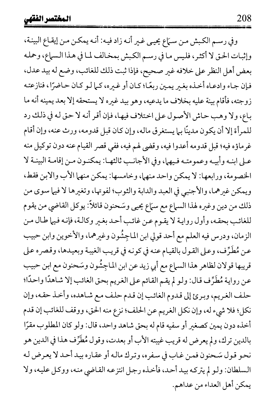 وفي رسم الكبش من سماع يحيى غير أنه زاد فيه: أنه يمكن من إيقاع البينة، وإثبات الحق لا أكثر، فليس ما في رسم الكبش بمخالف لما في هذا السماع، وحمله بعض أهل النظر على خلافه غير صحيح، فإذا ثبت ذلك للغائب، وضع له بيد عدل، فإن جاء وادعاه أخذه بغير يمين ربعًا؛ كان أو غيره، كما لو كان حاضرًا، فنازعته زوجته، فأقام بينة عليه بخلاف ما يدعيه، وهو بيد غيره لا يستحقه إلا بعد يمينه أنه ما باع، ولا وهب حاش الأصول على اختلاف فيها، فإن أقر أنه لا حق له في ذلك رد للمرأة إلا أن يكون مدينًا بما يستغرق ماله، وإن كان قبل قدومه، ورث عنه، وإن أقام غرماؤه فيه؛ قبل قدومه أعدوا فيه، وقضى لهم فيه، ففي قصر القيام عنه دون توكيل منه على ابنه وأبيه وعمومته فيهما، وفي الأجانب ثالثها: يمكنون من إقامة البينة لا الخصومة، ورابعها: لا يمكن واحد منهما، وخامسها: يمكن منهما الأب والابن فقط، ويمكن غيرهما، والأجنبي في العبد والدابة والثوب؛ لفوتها، وتغيرها لا فيما سوى من ذلك من دين وغيره لهذا السماع مع سماع يحيى وسحنون قائلًا: يوكل القاضي من يقوم للغائب بحقه، وأول رواية لا يقوم عن غائب أحد بغير وكالة، فإنه فيما طال من الزمان، ودرس فيه العلم مع أحد قولي ابن الماجشون وغيرهما، والأخوين وابن حبيب عن مطرف، وعلى القول بالقيام عنه في كونه في قريب الغيبة وبعيدها، وقصره على قريبها قولان لظاهر هذا السماع مع أبي زيد عن ابن الماجشون وسحنون مع ابن حبيب عن رواية مطرف قال: ولو لم يقم القائم على الغريم بحق الغائب إلا شاهدًا واحدًا؛ حلف الغريم، وبرئ إلى قدوم الغائب إن قدم حلف مع شاهده، وأخذ حقه، وإن نكل؛ فلا شيء به، وإن نكل الغريم عن الحلف؛ نزع منه الحق، ووقف للغائب إن قدم أخذه دون يمين كصغير أو سفيه قام له بحق شاهد واحد، قال: ولو كان المطلوب مقرًا بالدين ترك، ولم يعرض له قريب غيبته الب أو بعدت، وقول مطرف هذا في الدين هو نحو قول سحنون فمن غاب في سفره، وترك ماله أو عقاره بيد أحد لا يعرض له السلطان: ولو لم يتركه بيد أحد، فأخذه رجل انتزعه القاضي منه، ووكل عليه، ولا يمكن أهل العداء من عداهم.