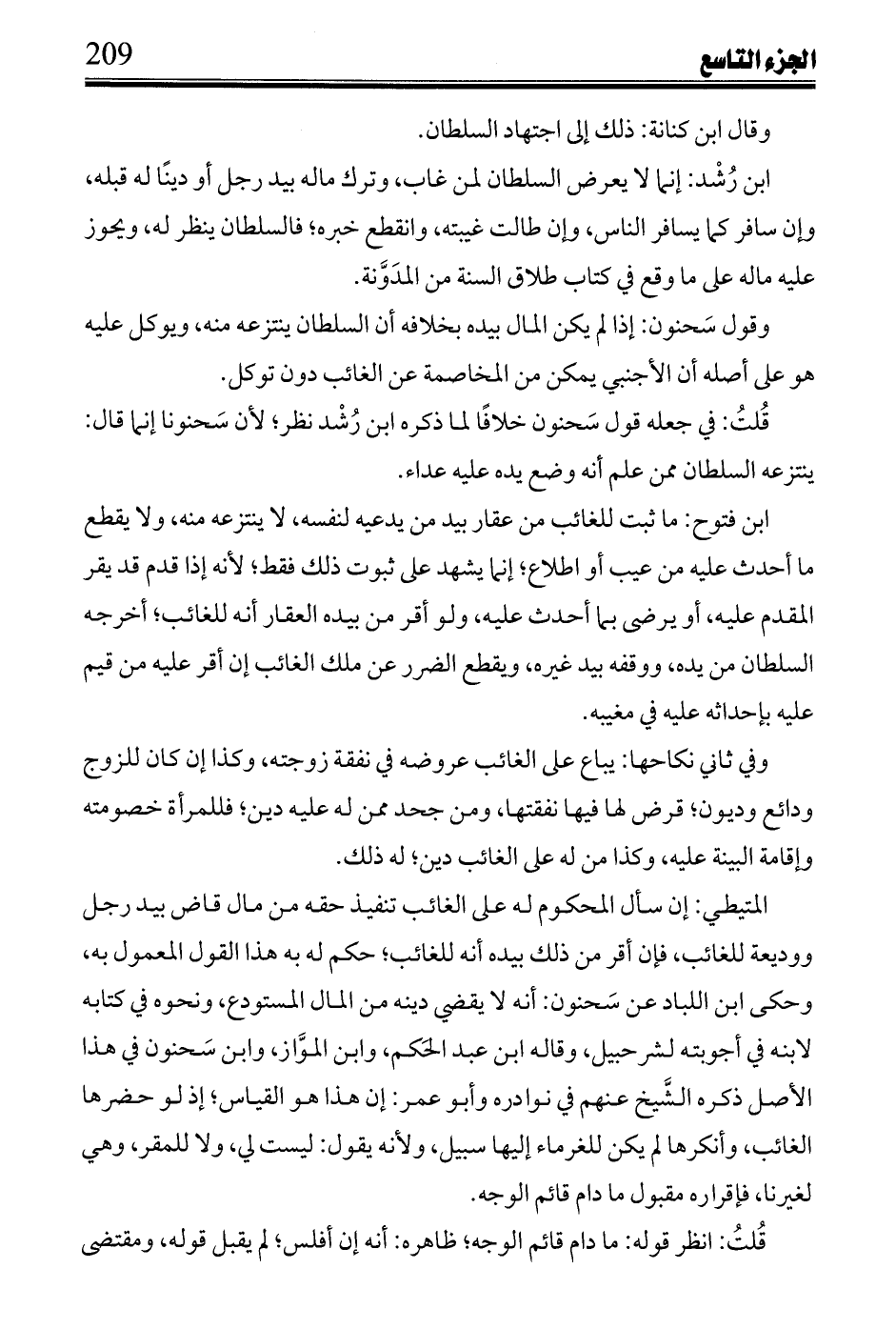 ابن رشد: إنما لا يعرض السلطان لمن غاب، وترك ماله بيد رجل أو دينًا له قبله، وإن سافر كما يسافر الناس، وإن طالت غيبته، وانقطع خبره؛ فالسلطان ينظر له، ويحوز عليه ماله على ما وقع في كتاب طلاق السنة من المدونة.