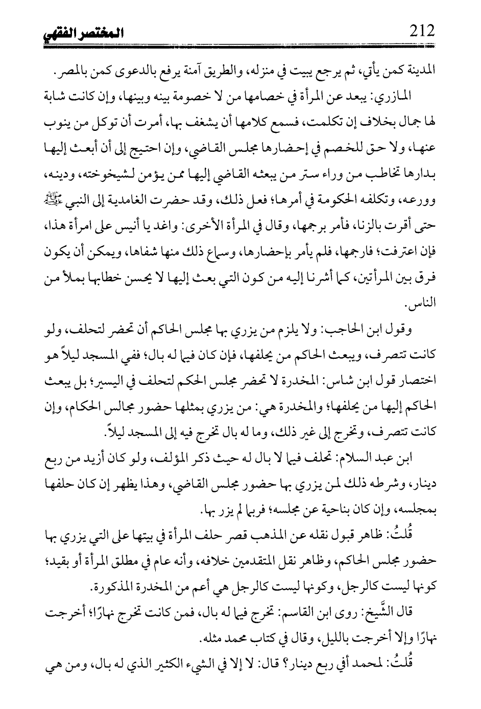 المازري: يبعد عن المرأة في خصامها من لا خصومة بينه وبينها، وإن كانت شابة لها جمال بخلاف إن تكلمت، فسمع كلامها أن يشغف بها، أمرت أن توكل من ينوب عنها، ولا حق للخصم في إحضارها مجلس القاضي، وإن احتيج إلى أن أبعث إليها بدارها تخاطب من وراء ستر من يبعثه القاضي إليها ممن يؤمن لشيخوخته، ودينه، وورعه، وتكلفه الحكومة في أمرها؛ فعل ذلك، وقد حضرت الغامدية إلى النبي صلى الله عليه وسلم حتى أقرت بالزنا، فأمر برجمها، وقال في امرأة الأخرى: واغد يا أنيس على امرأة هذا، فإن اعترفت؛ فارجمها، فلم يأمر بإحضارها، وسماع ذلك منها شفاها، ويمكن أن يكون فرق بين المرأتين وكما أشرنا إليه من كون التي بعث إليها لا يحسن خطابها بملأ من الناس.