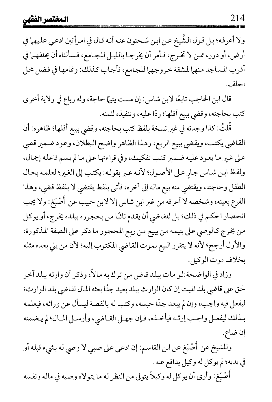 قلت: كذا وجدته في غير نسخة بلفظ كتب بحاجته، وقضي ببيع أقلها؛ ظاهرة: أن القاضي يكتب، ويقضي ببيع الربع، وهذا الظاهر واضح البطلان، وعمود ضمير قضي على غير ما يعود عليه ضمير كتب تفكيك، وفي قراءتها على ما لم يسم فاعله إجمال، ولفظ ابن شاس جار على الأصول؛ لأنه عبر بقوله: يكتب إلا الغير؛ لعمله بحال الطفل وحاجته، ويقتضي منه بيع ماله إلى آخره بلفظ يقتضي لا بلفظ قضي، وهذا الفرع بعينه، وشخصه لا أعرفه من غير ابن شاس إلا لابن حبيب عن أصبغ: ولا يجب انحصار الحكم في ذلك؛ بل للقاضي أن يقدم نائبًا من بحجوره ببلده يخرج، أو يركل من يخرج كالوصي على يتيمه مع يبيع من ربع المحجور ما ذكر على الصفة المذكورة، والأول أرجح؛ لأنه لا يتقرر البيع بموت القاضي المكتوب إليه لأن من يلي بعده مثله بخلاف موت الوكيل.