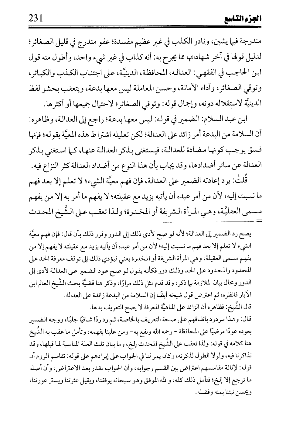 ابن عبد السلام: الضمير في قوله: ليس معها بدعة؛ راجع إلى العدالة، وظاهره: أن السلامة من البدعة أمر زائد على العدالة؛ لكن تعليله اشتراط هذه المعية بقوله؛ فإنها فسق يوجب كونها مضادة للعدالة، فيستغنى بذكر العدالة عنها، كما استغني بذكر العدالة عن سائر أضدادها، وقد يجاب بأن هذا النوع من أضداد العدالة كثر النزاع فيه.
